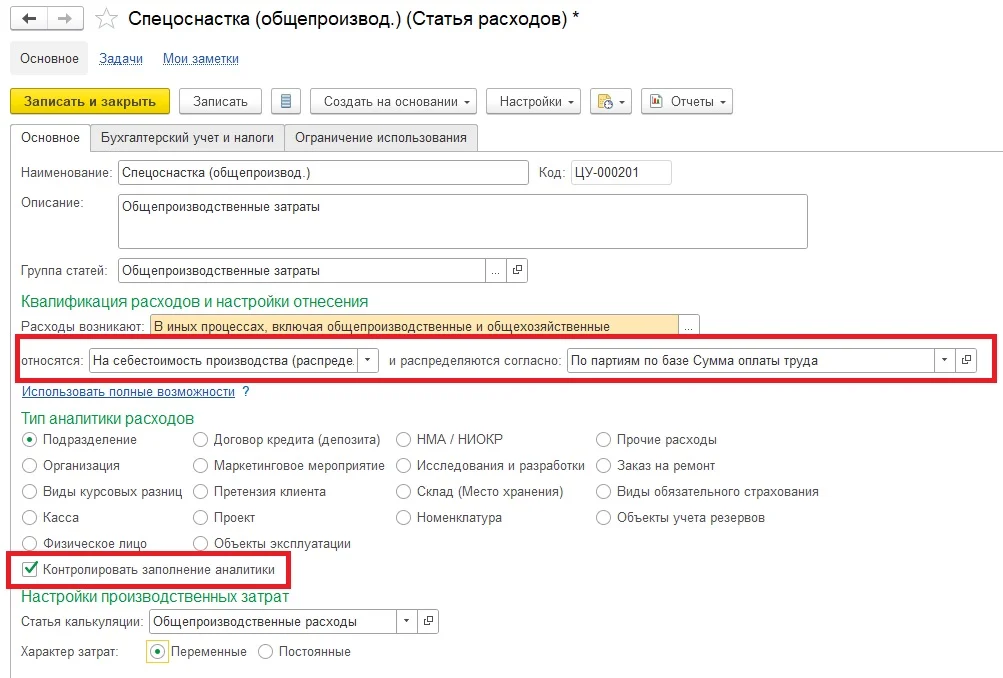 Также необходимо установить признак «Контролировать заполнение аналитики», чтобы при заполнении документов оперативного учета пользователь не забывал указывать аналитику.