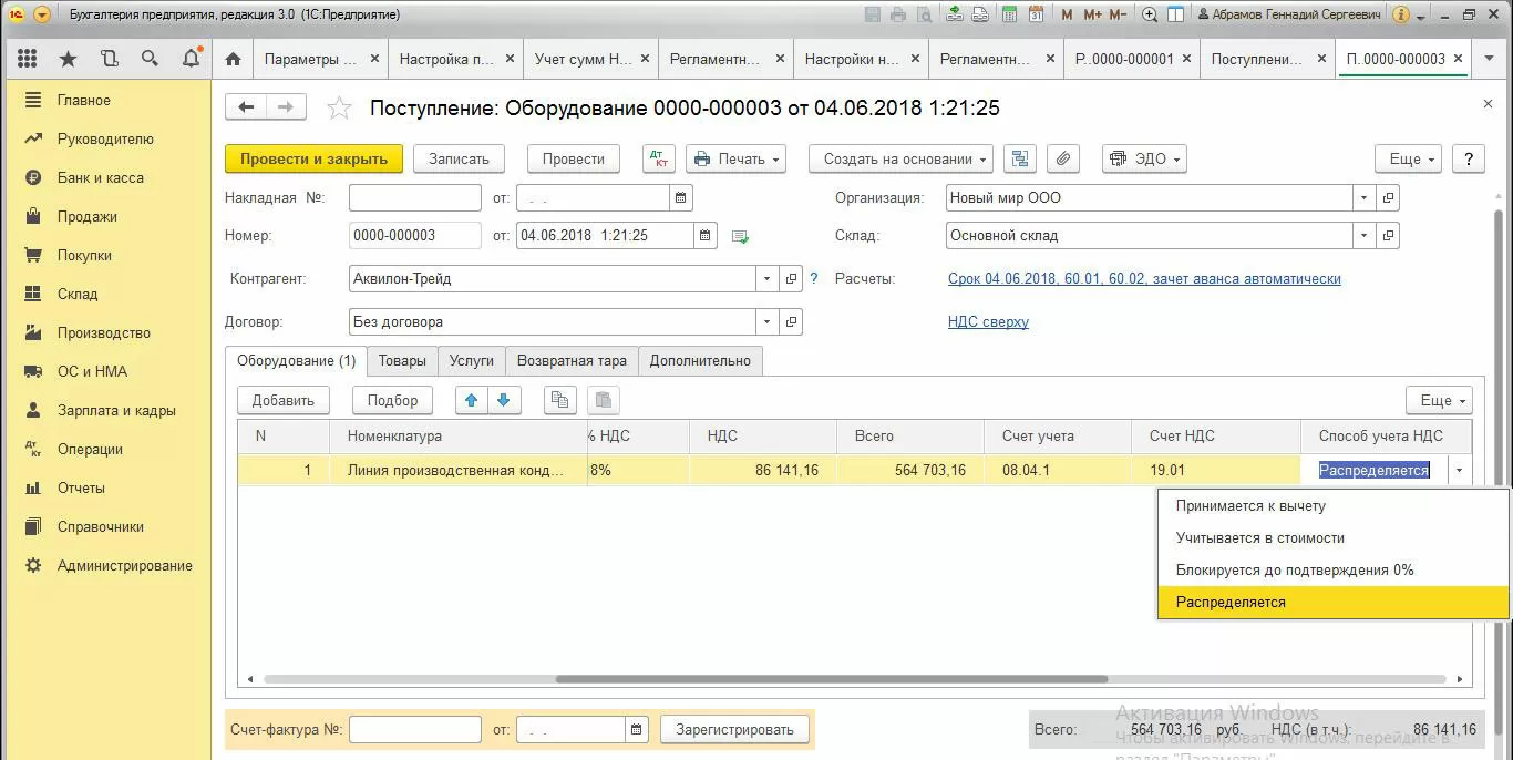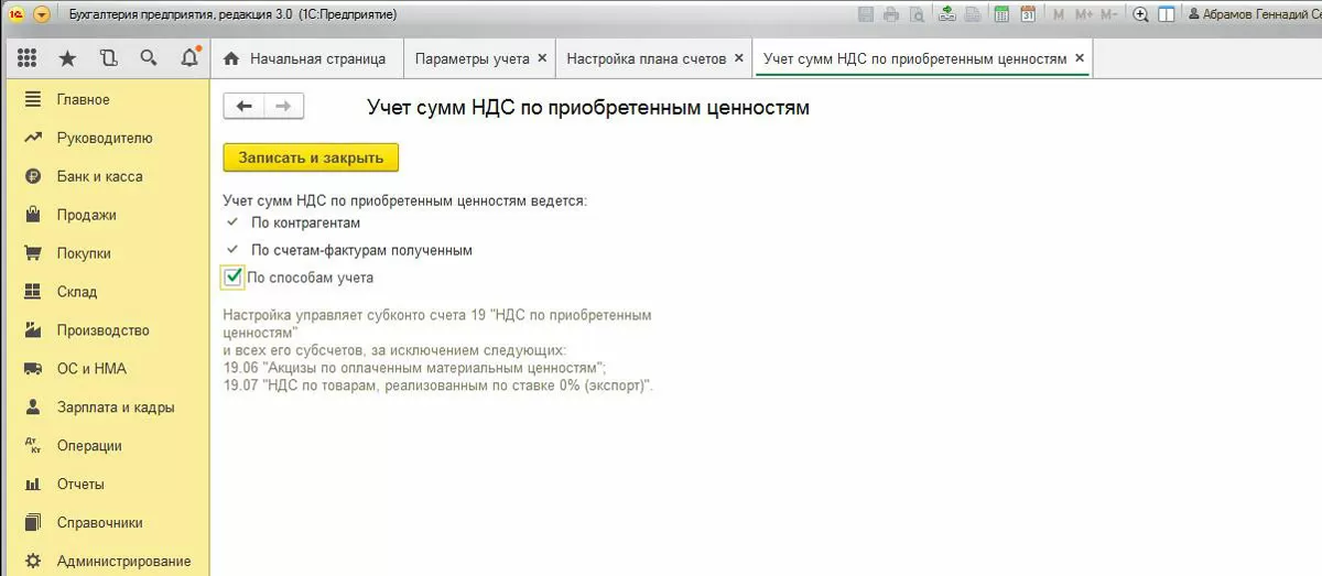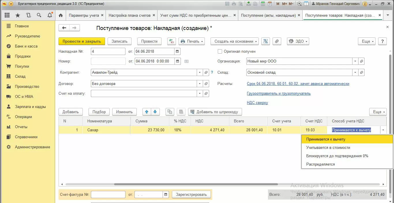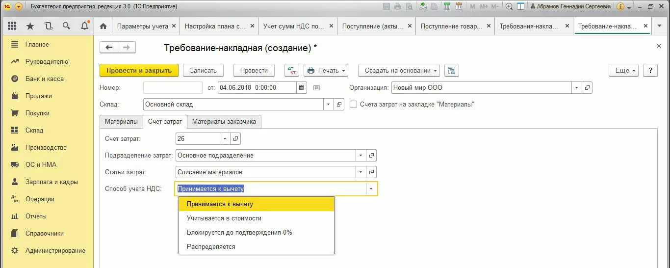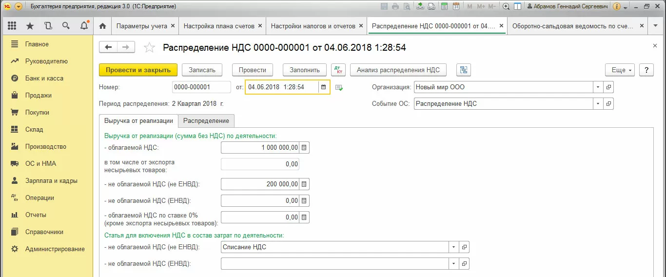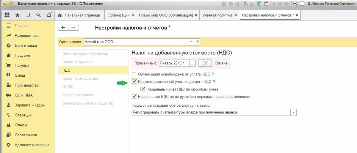 Ведение раздельного учета НДС в 1С на примере конфигурации 1С:Бухгалтерия 3.0