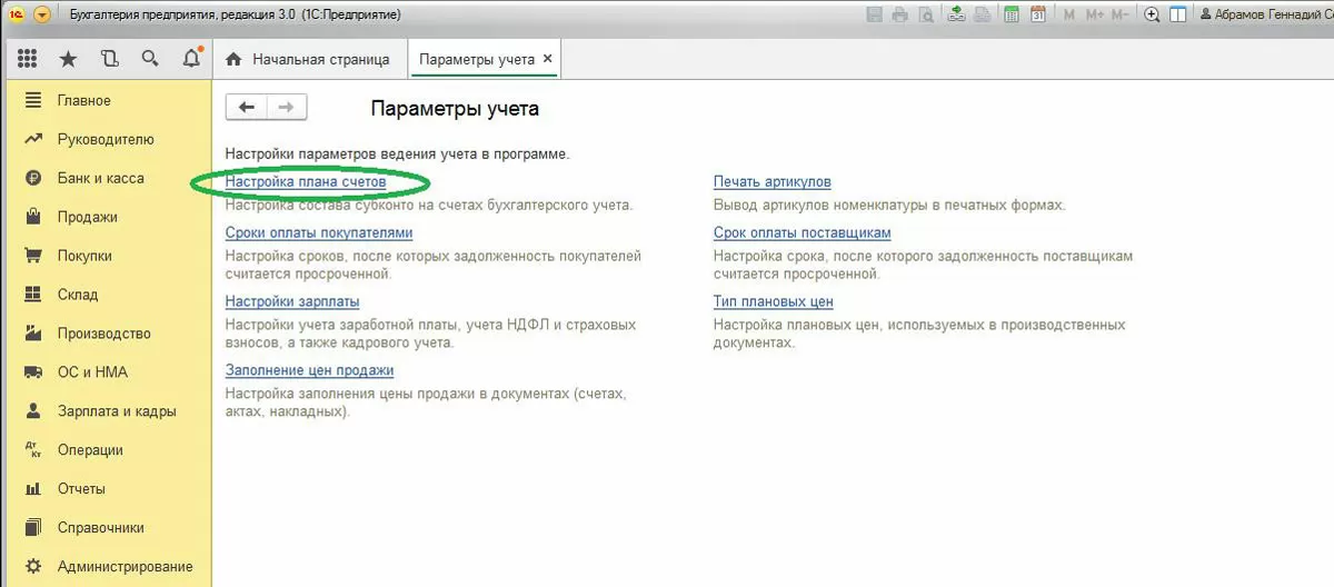 На следующем этапе в «Администрировании», в навигации находим «Параметры учета-Настройка плана счетов».