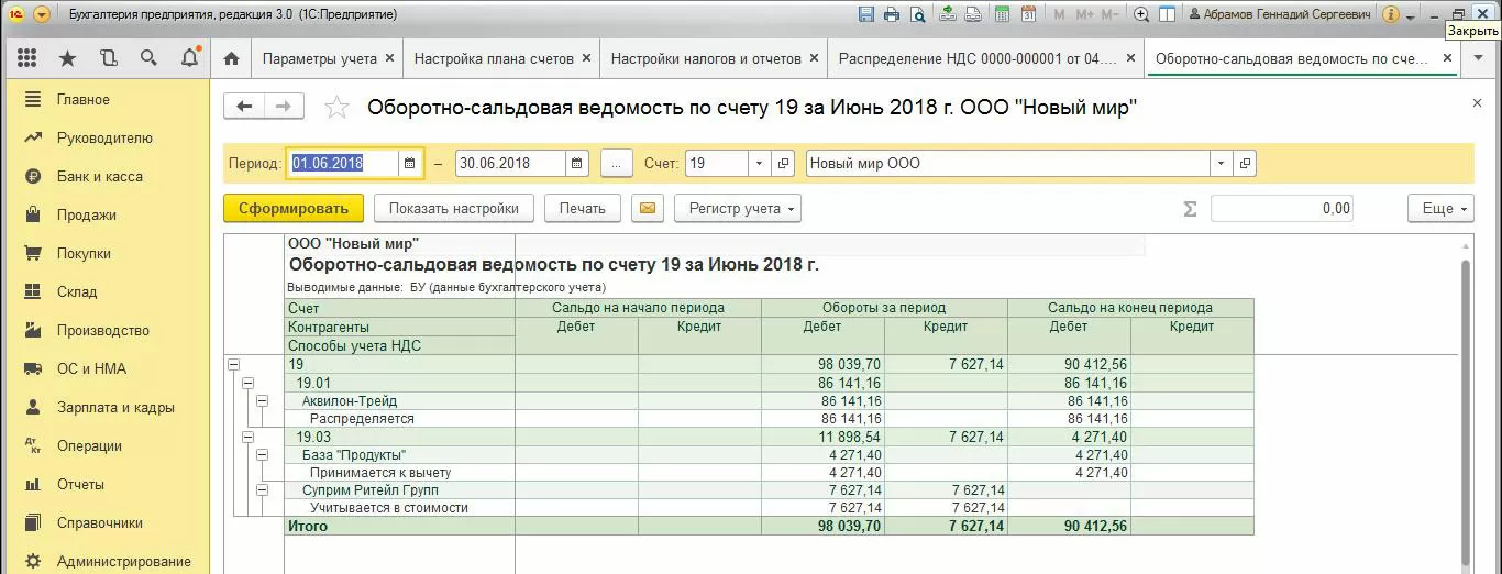 Посмотрим, как работает механизм разнесения НДС в Оборотно-сальдовой ведомости/ОСВ по сч.19.