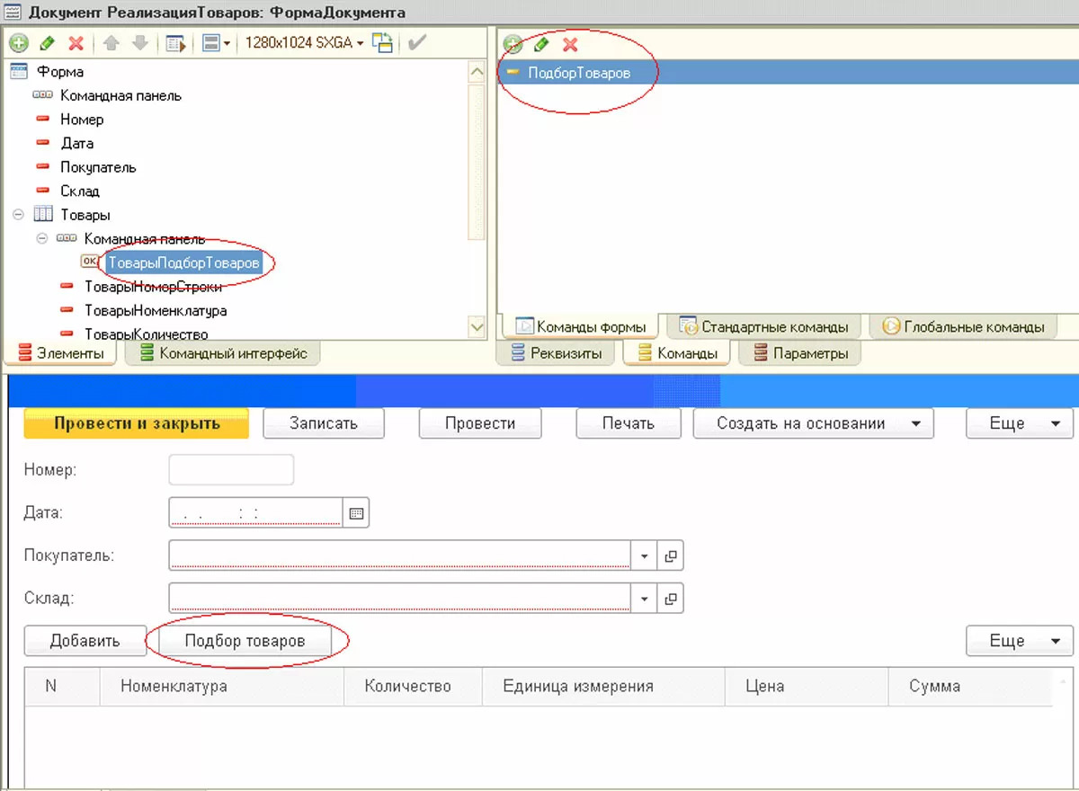 Переходим к форме документа «РеализацияТоваров» и добавляем команду «ПодборТоваров», размещаем ее на форме и прописываем действие этой команды: