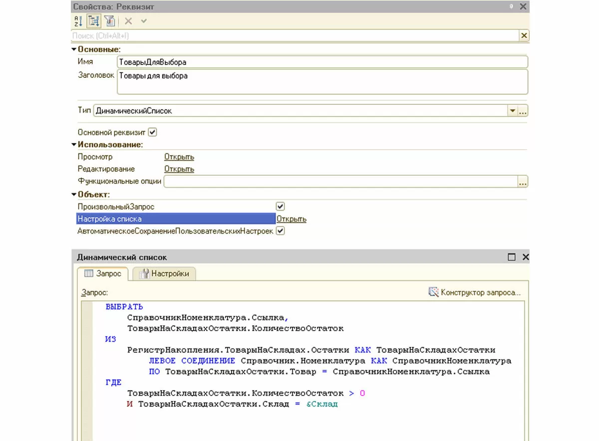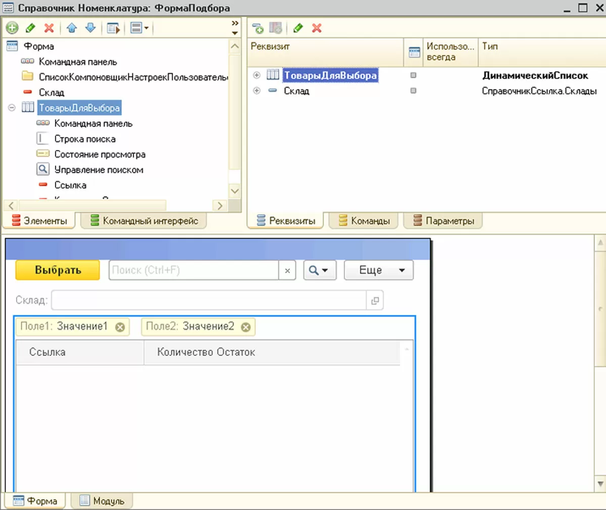В первую очередь нужно для справочника «Номенклатура» создать форму выбора и добавить реквизит «Склад» с типом «СправочникСсылка.Склады». Перенесем его на форму и проставим свойство «ТолькоПросмотр» в значение «Истина», чтобы пользователь видел, номенклатуру какого склада он выбирает. Уже существующий динамический список переименуем в «ТоварыДляВыбора»: