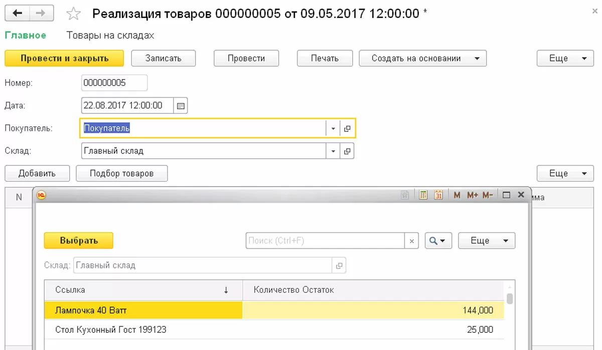 В процессе внедрения может возникнуть необходимость добавить возможность подбора. Выполнить эту задачу под силу разработчикам даже с небольшим опытом. Для примера, реализуем подбор в 1С остатков номенклатуры на определенном складе при заполнении табличной части документа «РеализацияТоваров».