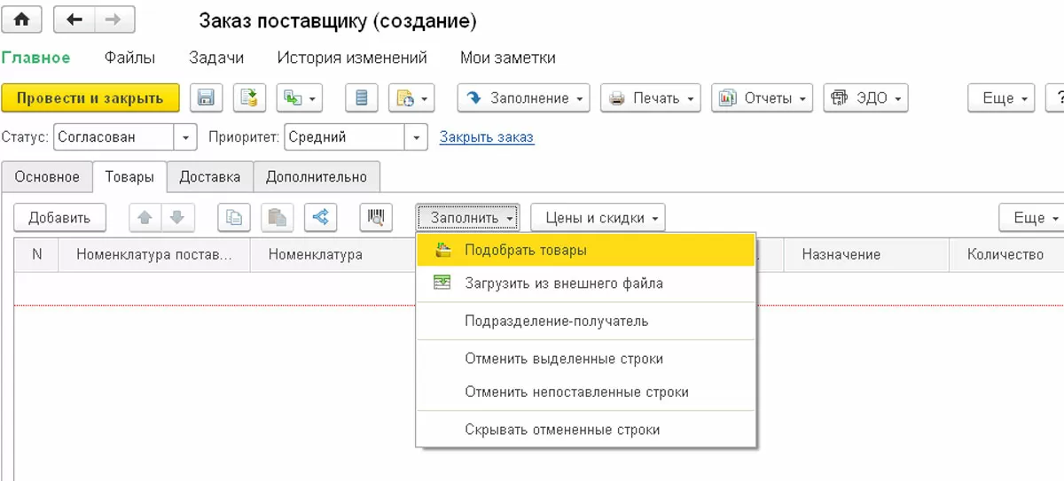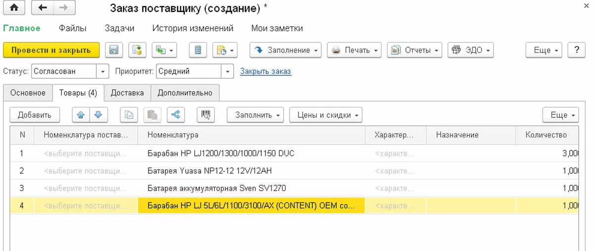 После того как подобран нужный перечень номенклатуры и проставлено количество, пользователи нажимают на кнопку «Перенести в документ», и выбранные позиции переносятся в «ЗаказПоставщику», вместе с введенным количеством. Подбор 1С существенно экономит время сотрудникам компании и облегчает их труд.