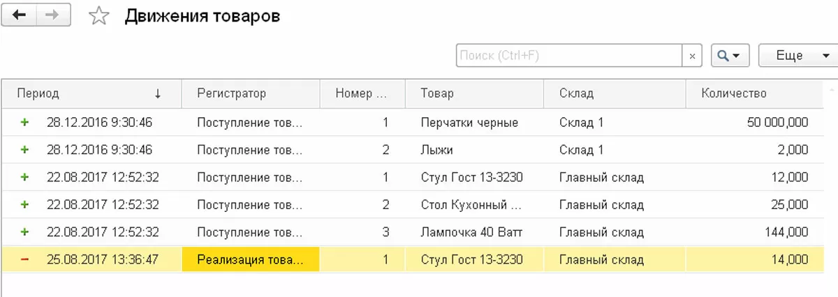 Все приготовления окончены, остается только обновить конфигурацию и проверить, работает ли подбор в 1С по складу и положительным остаткам. После обновления и отсутствия ошибок, проверяем текущую ситуацию в регистре накопления «ТоварыНаСкладах», где существуют следующие записи: