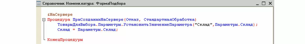 В качестве условия отбора по складу берем значение из документа из поля Склад. Нужно, чтобы новая форма подбора справочника «Номенклатура» получила значение склада, по которому будут отбираться остатки. Для этого в модуле формы подбора необходимо заполнять переменную написанного нами запроса из параметров формы в стандартной процедуре «ПриСозданииНаСервере»: