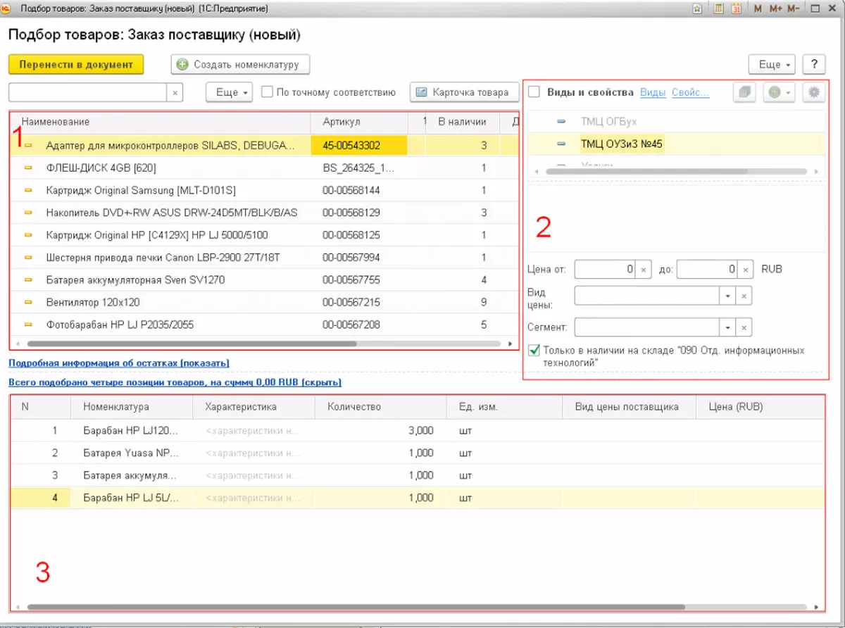 В данном примере запуск окна подбора товаров в документе «ЗаказПоставщику» происходит через кнопку «Подобрать товары». Нажав ее, пользователь видит окно подбора, разделенное на несколько областей: