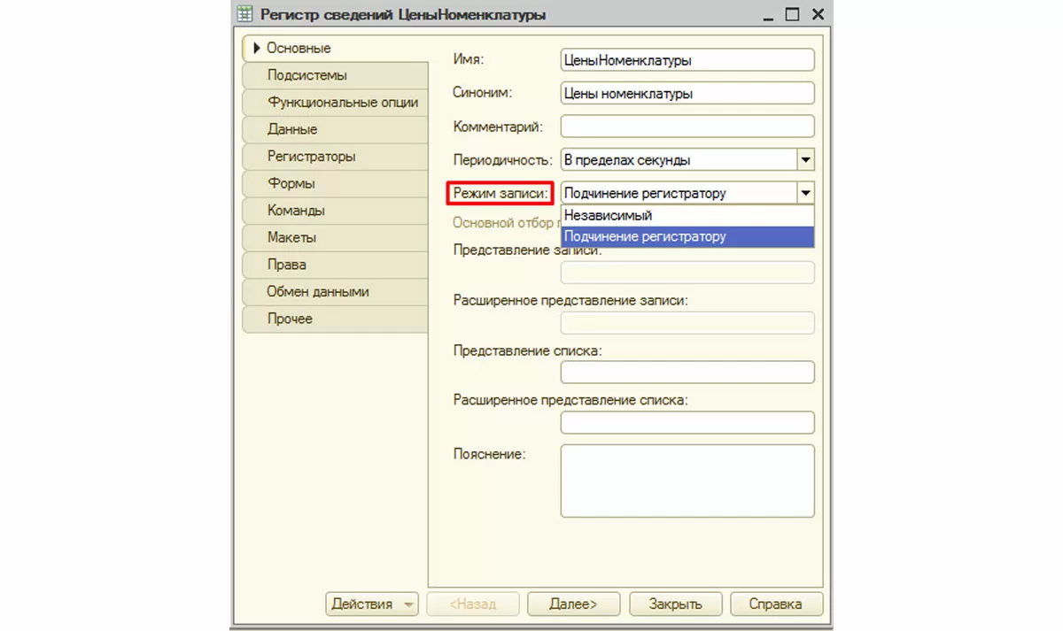 Также можно указать режим записи. Первый с «Подчинением регистратору», при котором записи будут регистрироваться документами и в каждой из них будет указан документ-регистратор. Если выбирать второй – независимый режим, то данные регистрируются не регистратором, а добавляются, например, непосредственно из списка или как обработка.