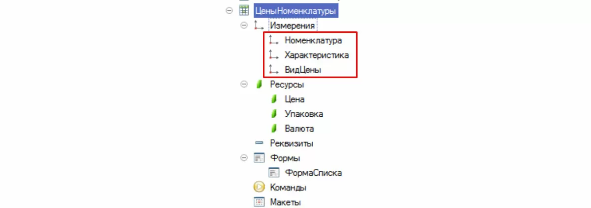 На последних мы остановимся поподробнее, поскольку они позволяют компилировать данные из БД по разрезам измерений. Например, в «Ценыноменклатуры» хранятся данные для конкретной номенклатуры и характеристики по определенному виду цен.