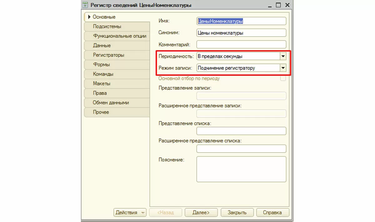 Регистр бывает как периодическим, так и непериодическим, когда не нужно сохранять последовательность изменений. Но если все-таки хранить нужно, то устанавливается, в пределах какого периода программа установит контроль уникальности записей: посекундно, за день, месяц, за квартал и год.
