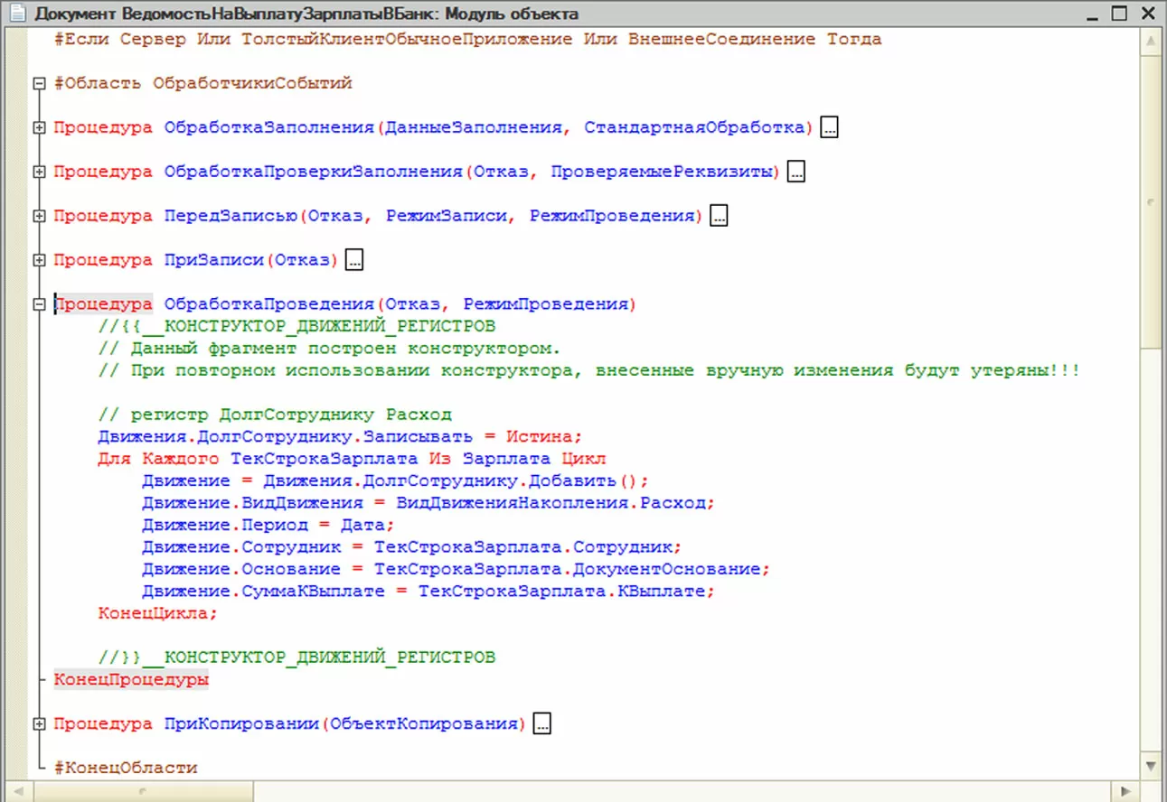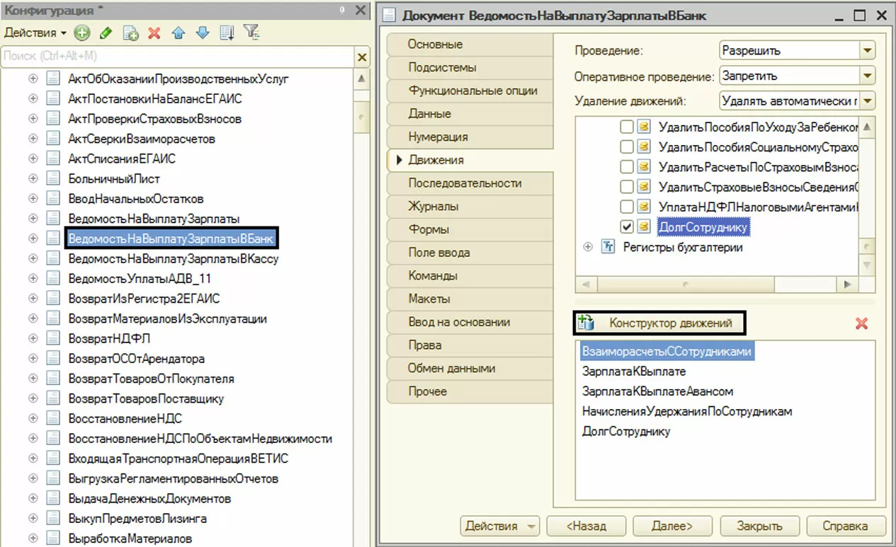 Для того чтобы наш регистр работал, необходимо выполнить некоторые настройки в самом документе движения. Откроем в дереве метаданных документ «ВедомостьНаВыплатуЗарплатыВБАнк». На закладке «Движения» мы видим наш новый регистр «ДолгСотруднику». Далее с помощью кнопки «Конструктор движений» нам нужно сопоставить, в какие поля, какие данные из документа должны фиксироваться.