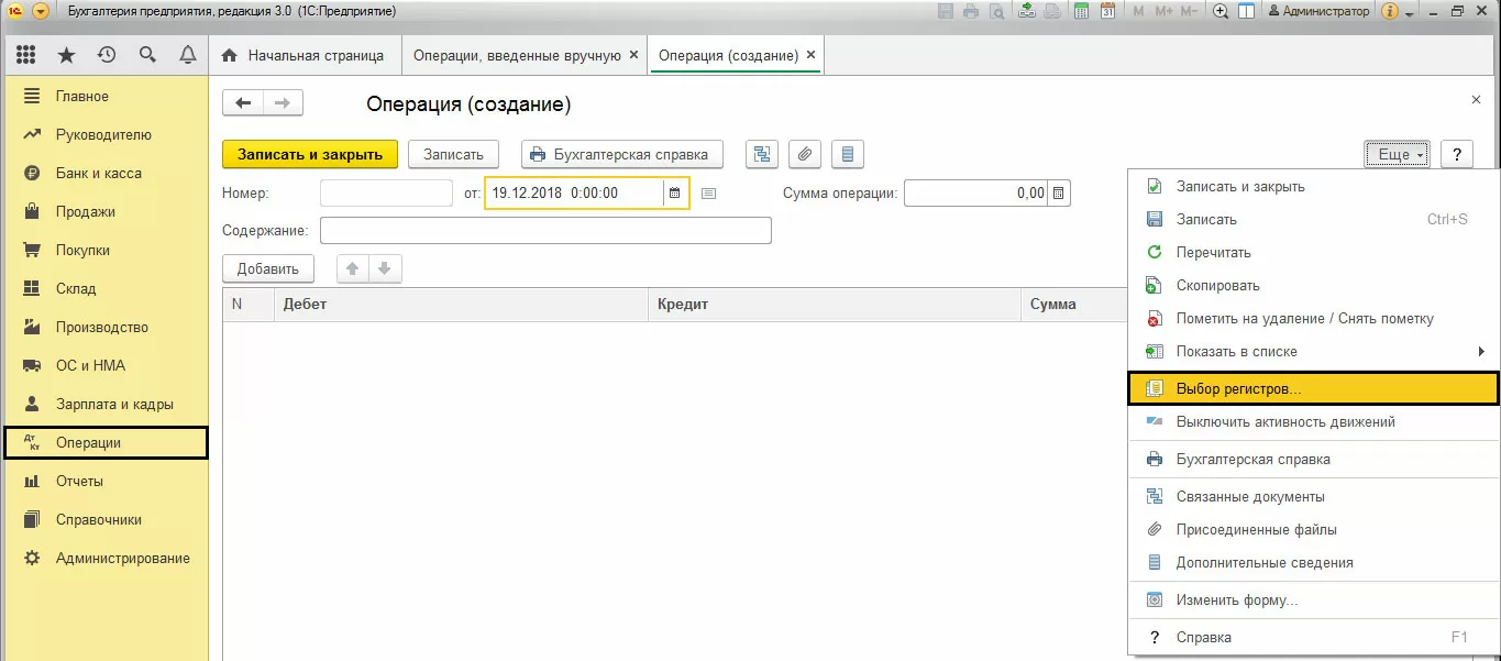 Иногда возникает необходимость обнулить или подкорректировать записи регистров накопления. Для этого в «1С:Бухгалтерия» можно воспользоваться документом «Операция введенная вручную» (в разделе меню «Операции»). Создав новую операции, перейдем по кнопке «Еще» к пункту «Выбор регистров».