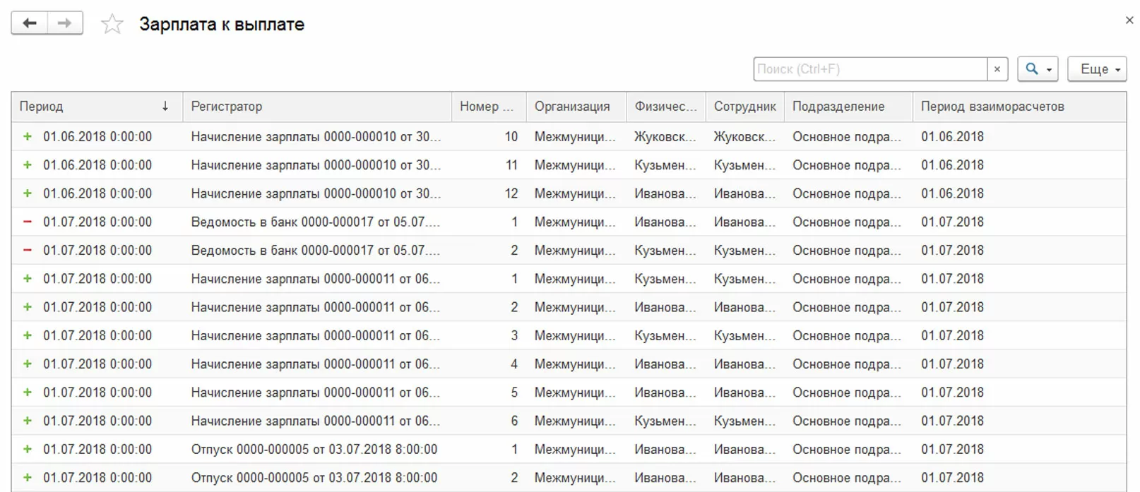 Регистр накопления – это таблица, накапливающая информацию из движения документов (приход/расход, обороты). Откроем для примера регистр накопления «Зарплата к выплате». Мы видим, что строки «Начисление зарплаты» и «Отпуск» отмечены знаком «+», т.е. увеличивают данные регистра, а «Ведомость в банк» (документ, которым произведена выплата) отмечен знаком «-», т.е. уменьшает данные регистра по каждой записи, в данном случае – по физическому лицу (сотруднику).