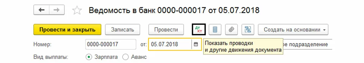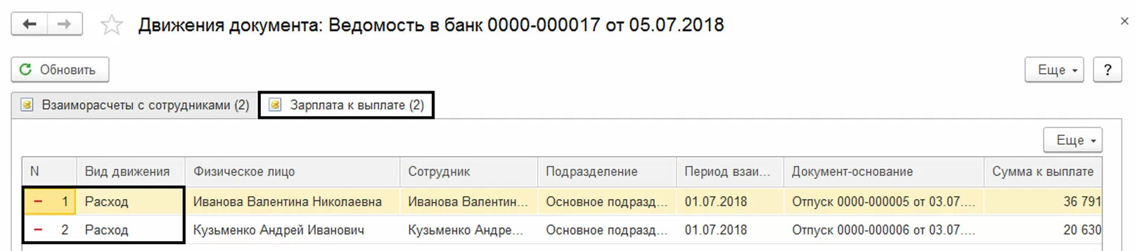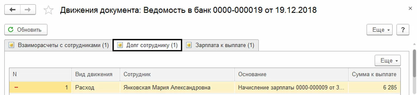 Проведем документ «Ведомость в банк» и посмотрим, какие движения по регистрам он сформировал (кнопка Кнопка – «Показать проводки и другие движения документа»). Мы видим, что у нас появилась закладка с движениями по нашему регистру «Долг сотруднику» - строка «Расход».