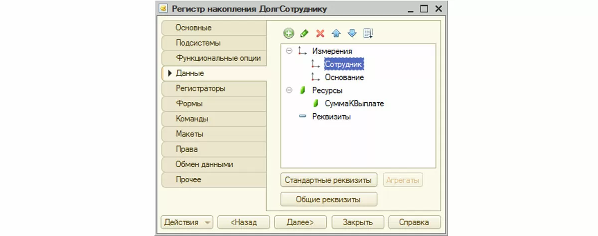 На закладке «Данные» добавим для примера несколько измерений – «Сотрудник» и «Основание» (отражающий документ основание записи).