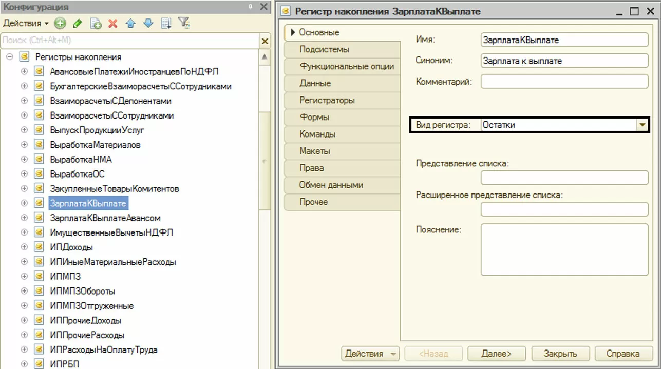 Мы можем разрабатывать свои регистры накопления при необходимости. Но для этого сначала разберемся в его настройках. Рассмотрим настройки регистра накопления на том же примере с зарплатой к выплате. Откроем регистр «ЗарплатаКВыплате». На закладке «Основные» мы видим имя регистра и его вид.