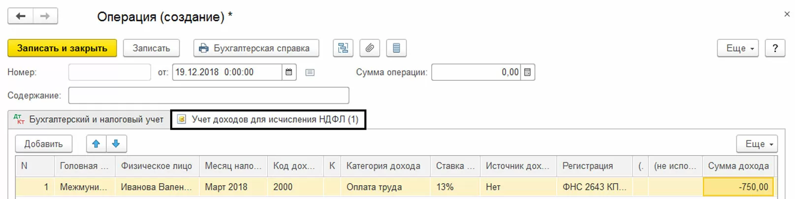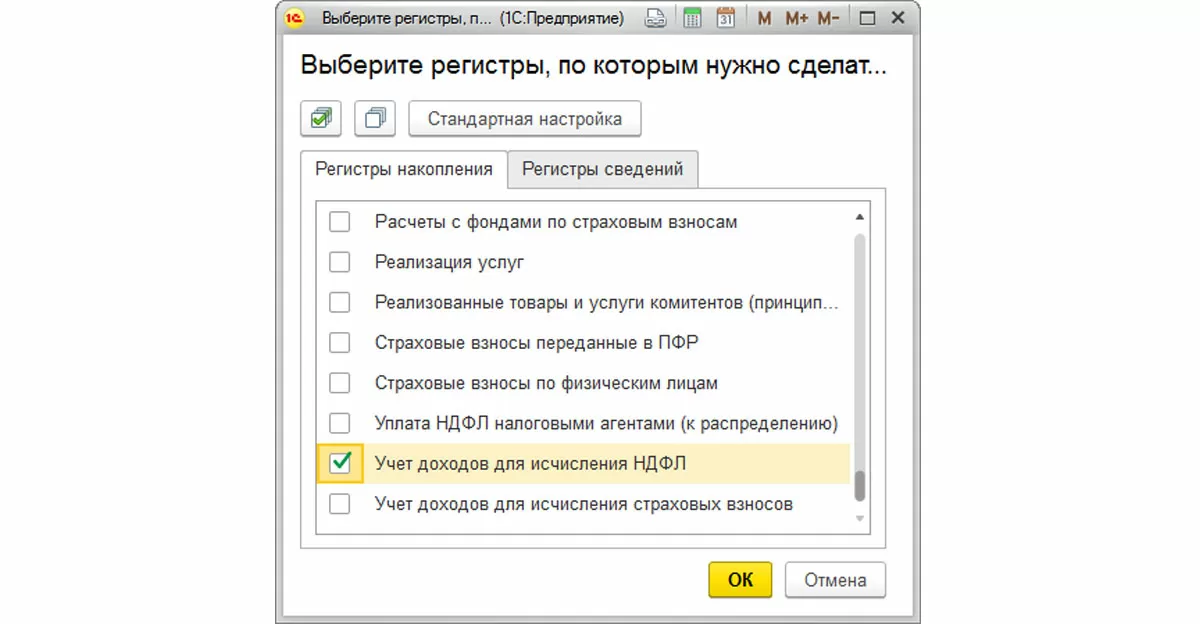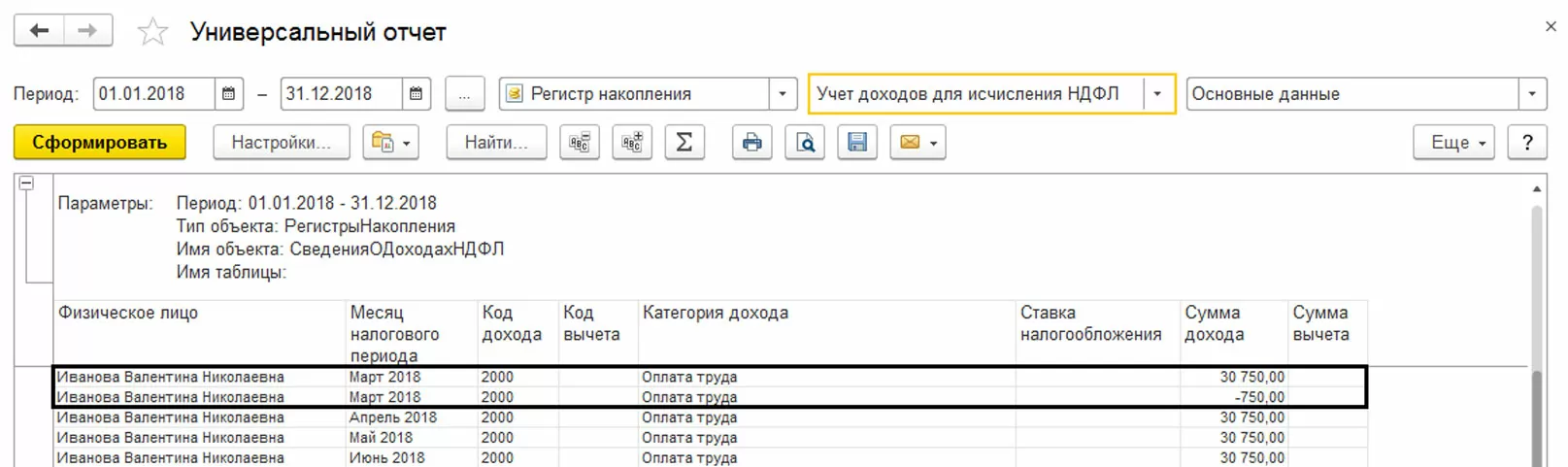 Сформировать отчет по регистрам накопления, мы можем, воспользовавшись «Универсальным отчетом» (раздел «Отчеты»), выбрать вариант отчета – по регистрам накопления, и указать нужный для анализа регистр. В отчете мы видим, что в нем отразилась наша корректировочная запись по регистру «Учет доходов для исчисления НДФЛ».