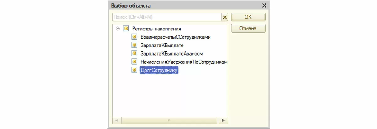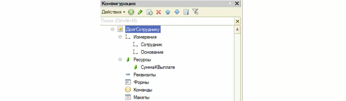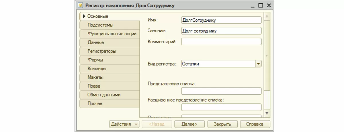 Продолжим рассматривать пример с регистрами по зарплате. Создадим новый регистр накопления (кнопка «Добавить») и назовем его «ДолгСотруднику».