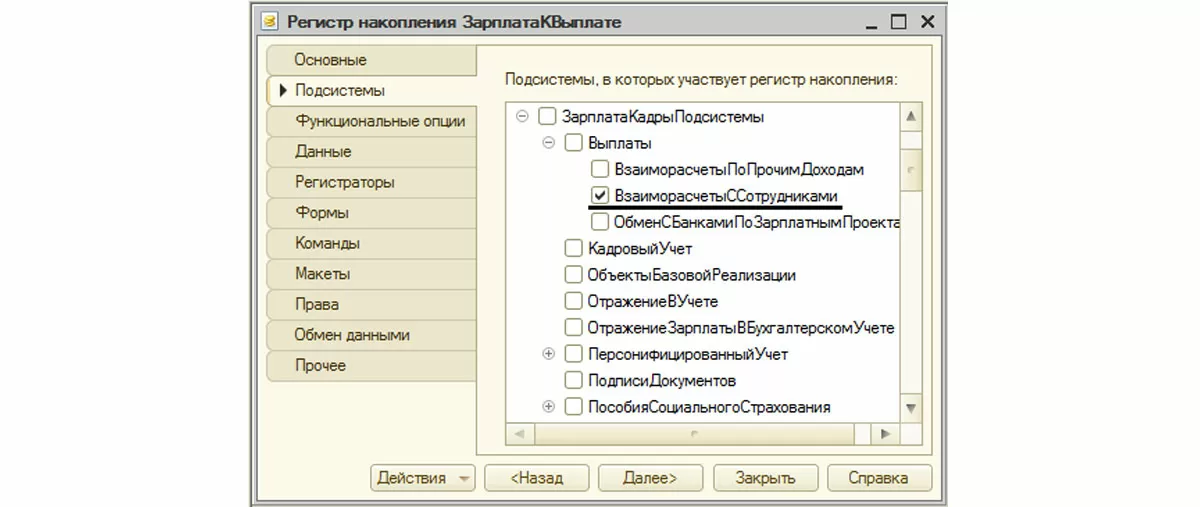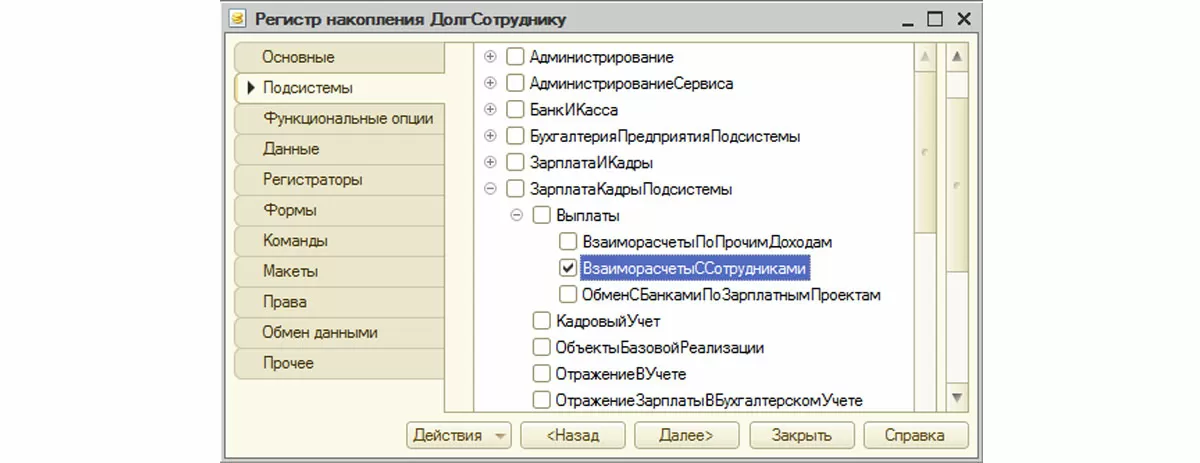 На закладке «Подсистемы» указываем подсистему «ВзаиморасчетыССотрудниками».