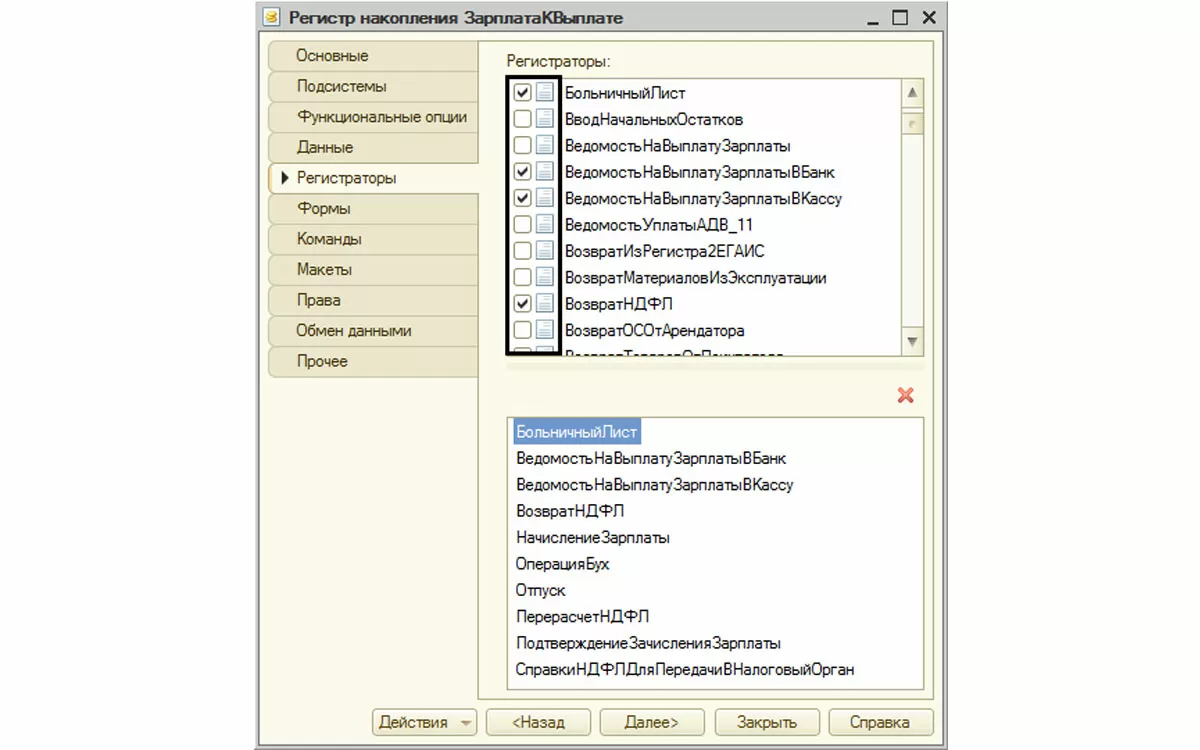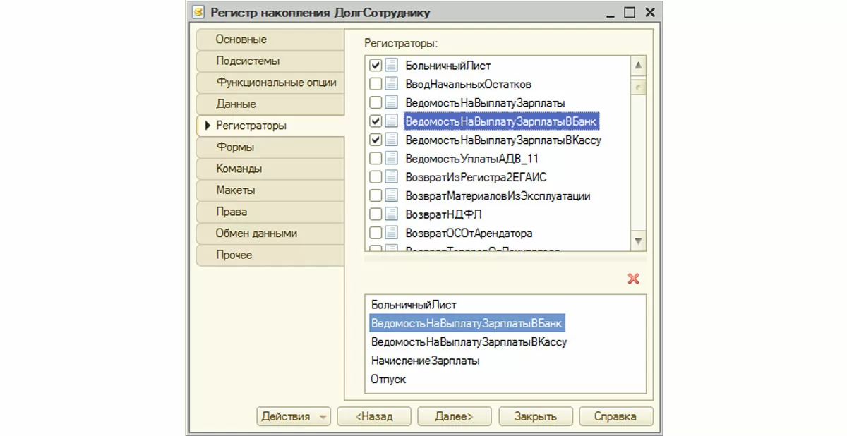 На закладке «Регистраторы» перечислим документы, которые будут производить запись в наш регистр. В нашем примере сделаем акцент на документе «Ведомость на выплату зарплаты в банк» и далее будем следить за движениями регистра, сделанными этим документом.