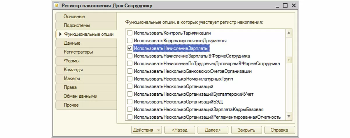 На «Функциональные опции», в которых участвует наш регистр, устанавливаем галочку «ИспользоватьНачислениеЗарплаты» (блок учета заработной платы в конфигурации «Бухгалтерия»).