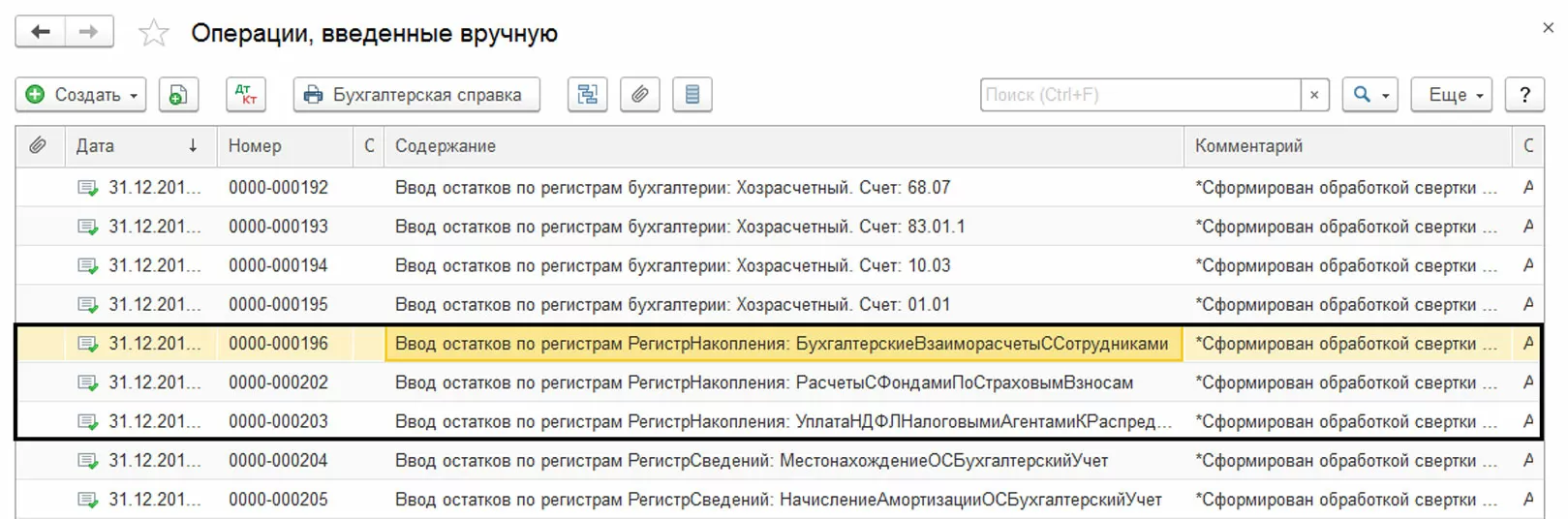Еще один способ очистки регистров и их корректировки – это выполнение свертки информационной базы. Подробно мы на этом останавливаться не будем, т.к. это отдельная тема. Отмечу лишь, что в результате этой процедуры все остатки по счетам и регистрам переносятся в операции, записанные концом года, удаляя при этом все документы. Записи формируются отдельно по каждому регистру и при необходимости их можно откорректировать или удалить.