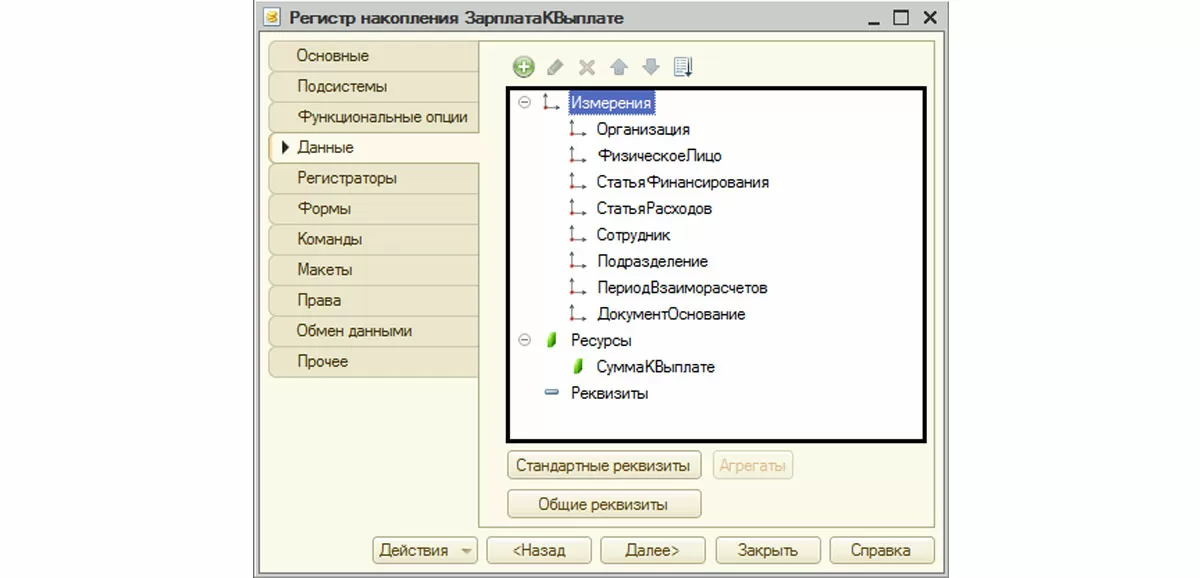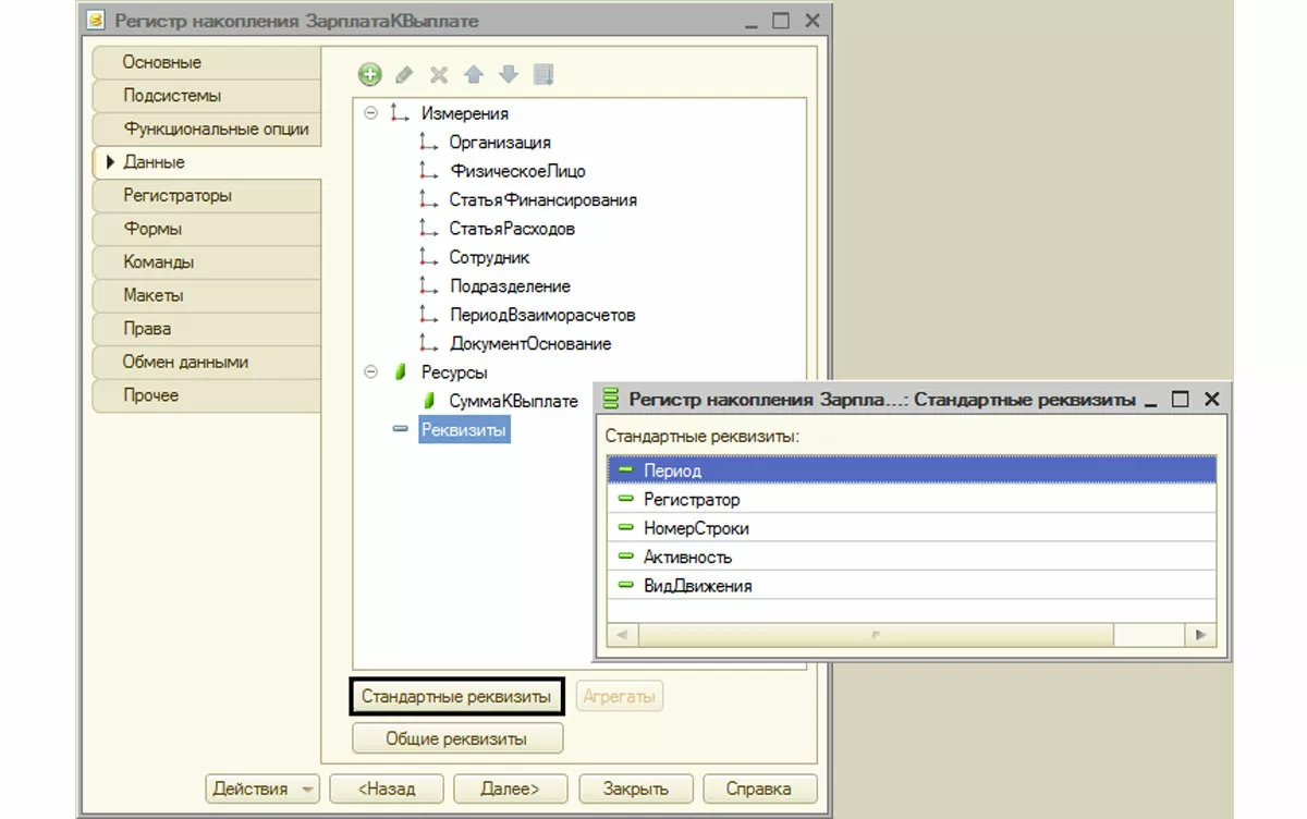 Раздел «Реквизиты» предназначен для хранения сопутствующей информации и используется на усмотрение пользователя. Существует еще один набор стандартных реквизитов, список которых не изменяется. Кнопка «Агрегаты» активна только для регистров с видом «Обороты».