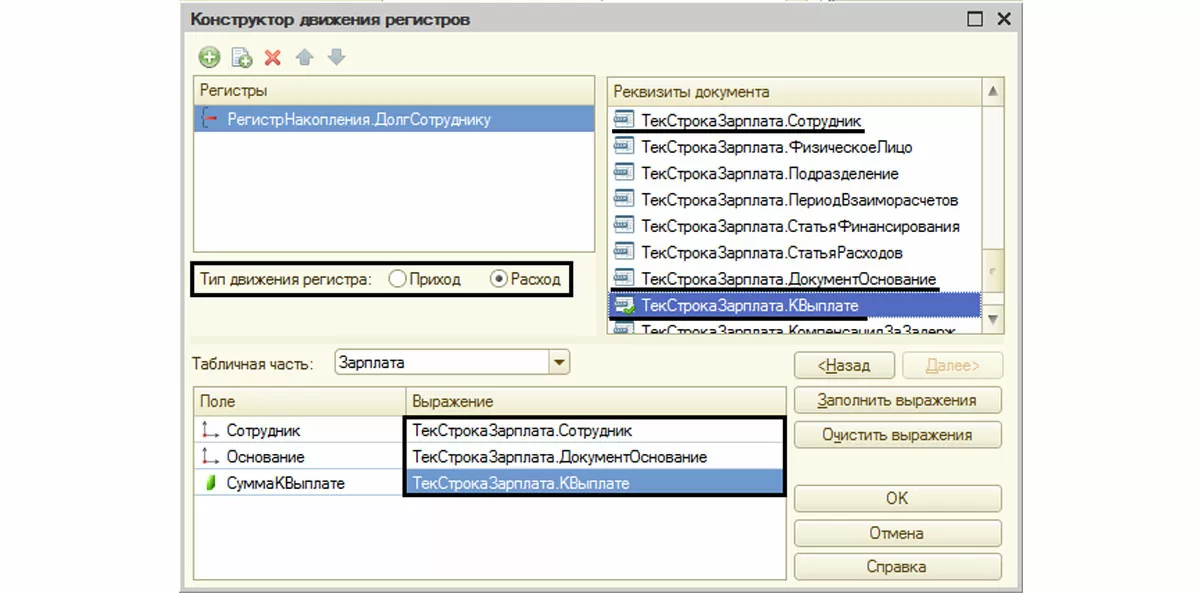 Тип движения в нашем примере «Расход» (т.к. выплачивая зарплату, мы уменьшаем задолженность сотруднику). И в таблицу с реквизитами надо прописать (сопоставив) реквизиты документа. Выбрать их можно двойным щелчком на соответствующей строке. Заполнив, нажимаем «Ок».