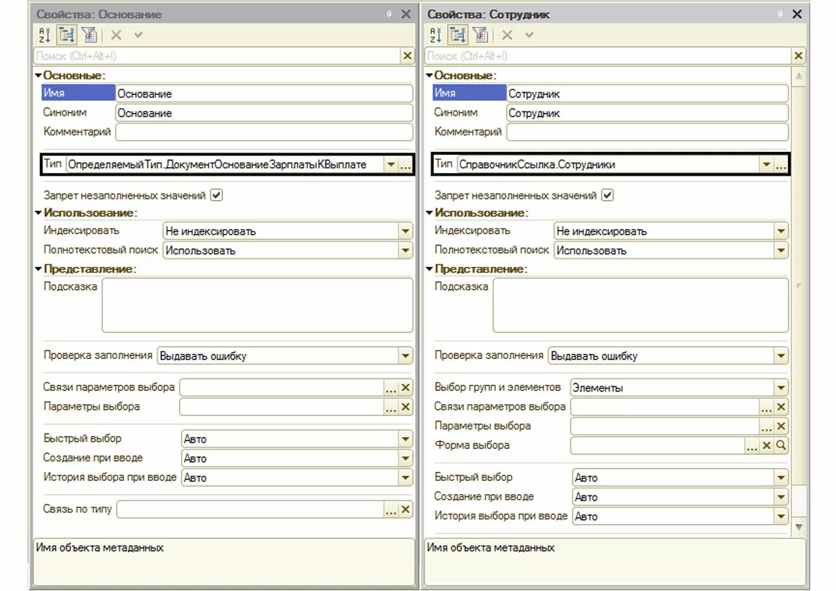 Для измерения «Сотрудник» указываем тип – СправочникСсылкаСотрудники, а для «Основания» – ОпределяемыйТипДокументОснованияЗарплатыКВыплате.