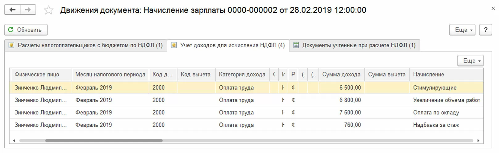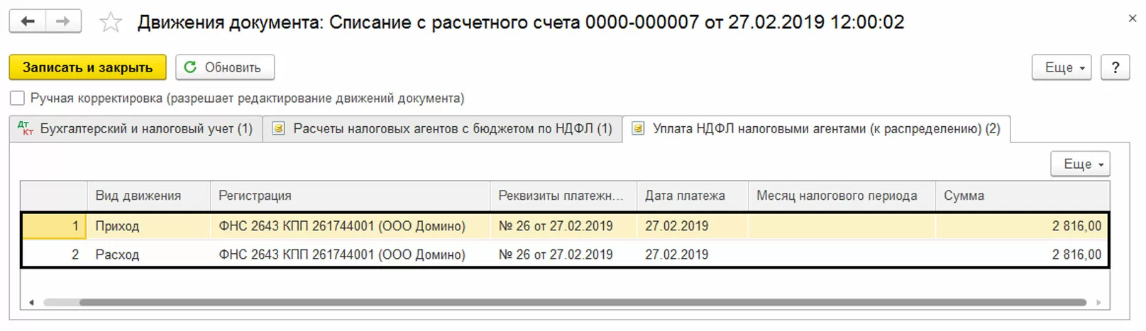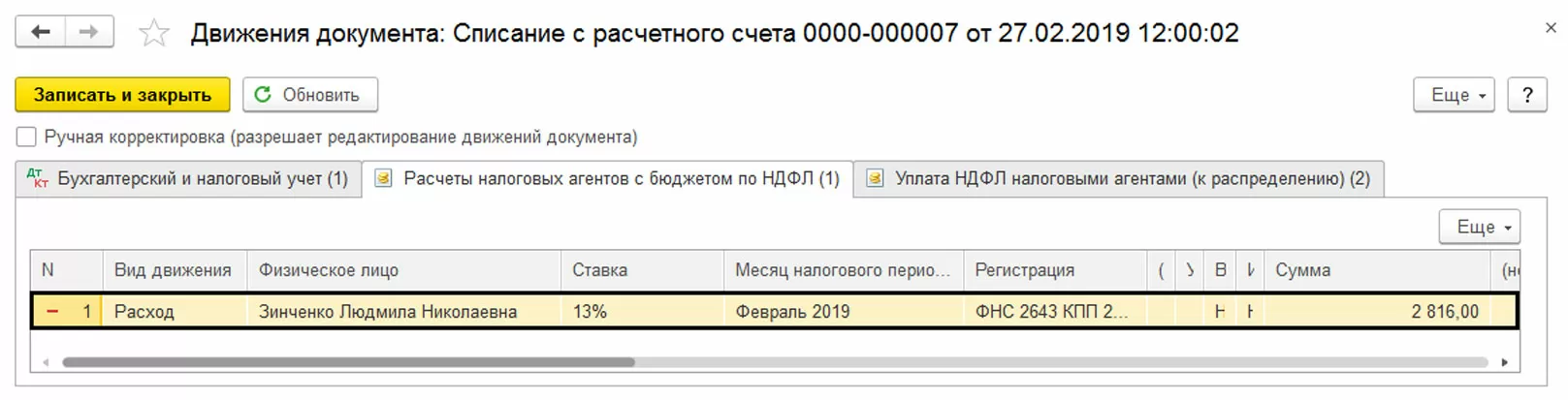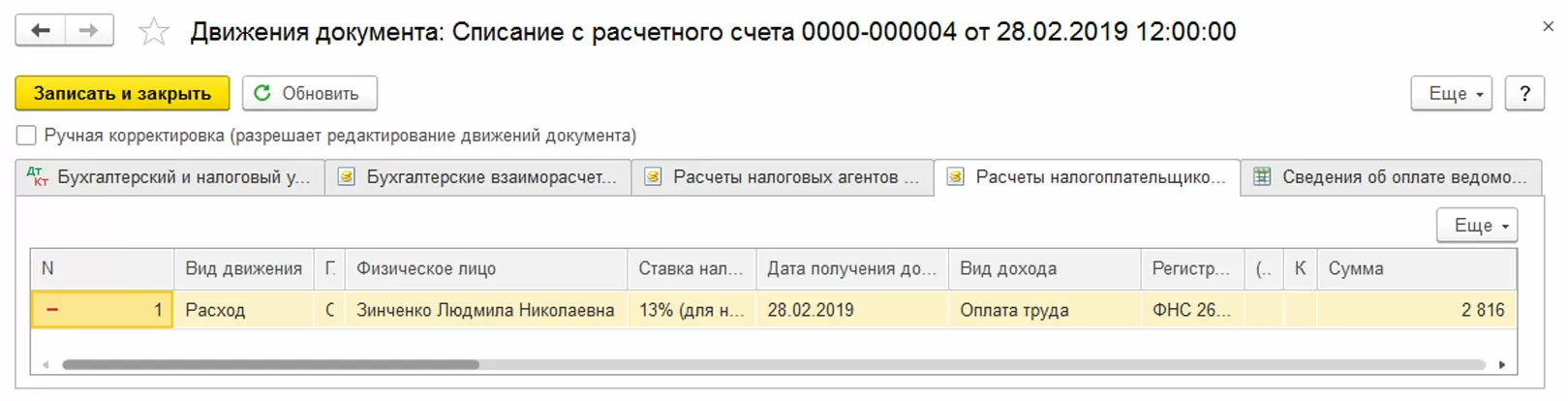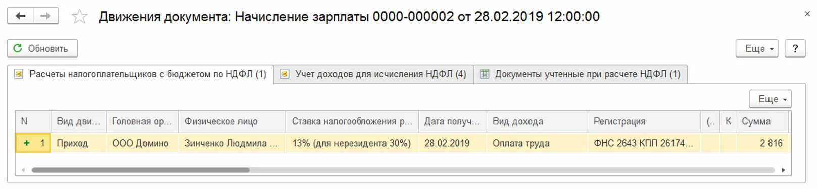 И если мы посмотрим движения регистров, сформированных этим документом, мы увидим, что сумма НДФЛ удерживается именно при проведении этого документа – запись в регистр накопления «Расчеты налогоплательщиков с бюджетом по НДФЛ» - строка «Расход».