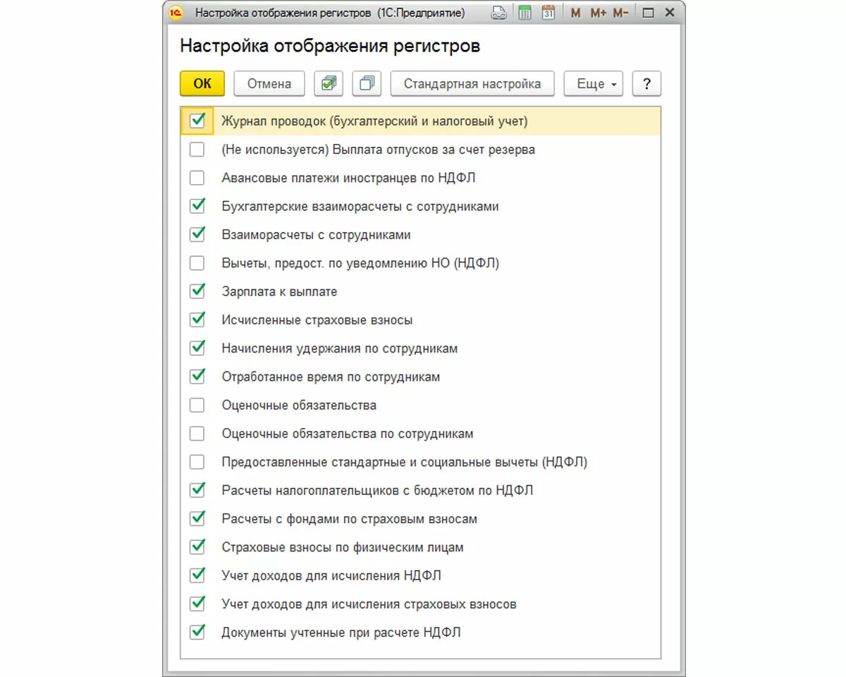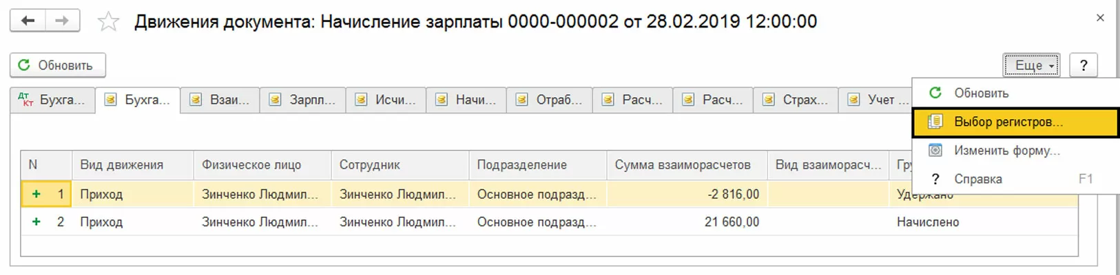 На закладках открывшегося окна отобразятся записи регистров расчета. Нажав кнопку «Еще», мы можем настроить, какие регистры отображать или скрыть.