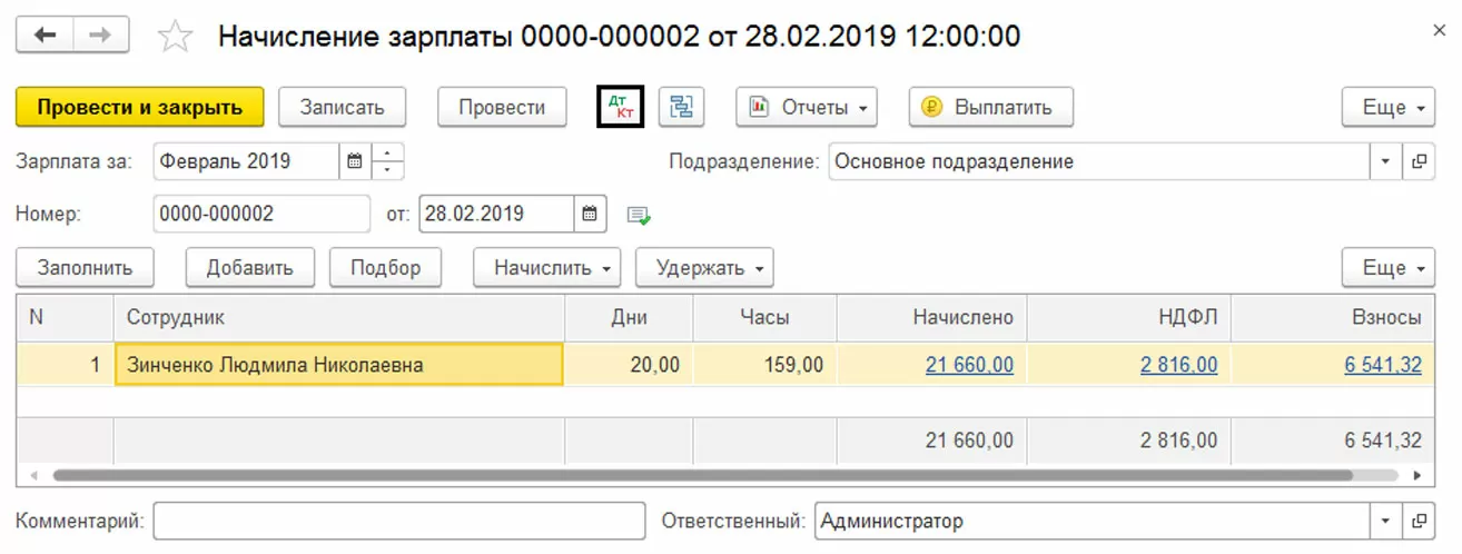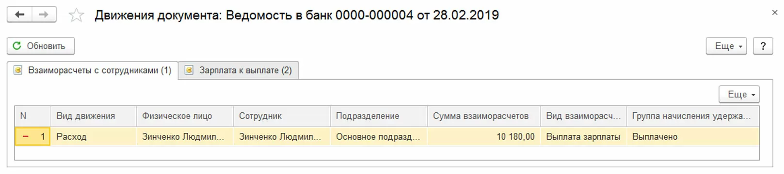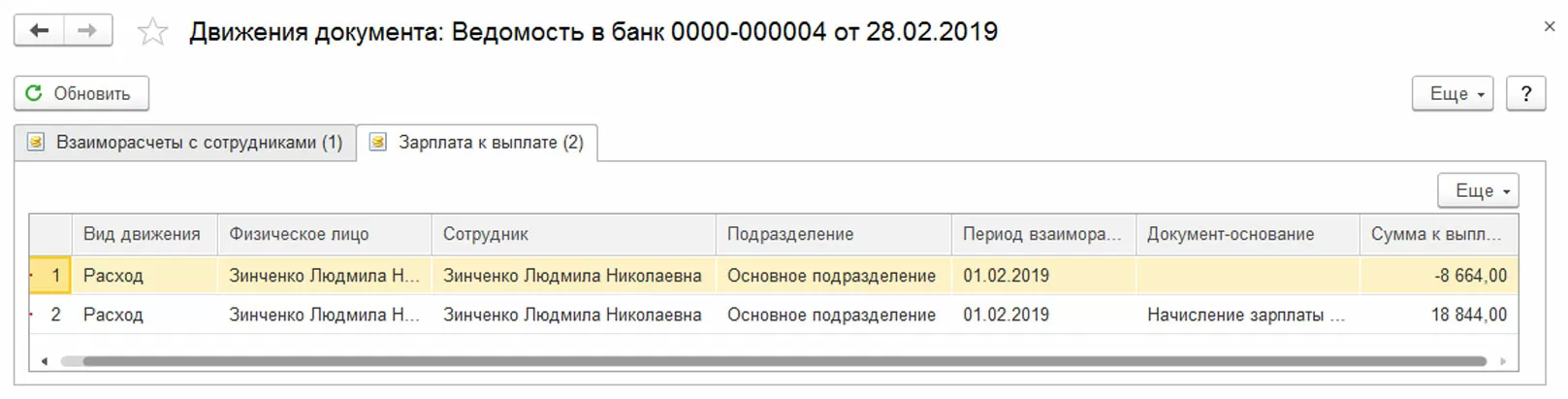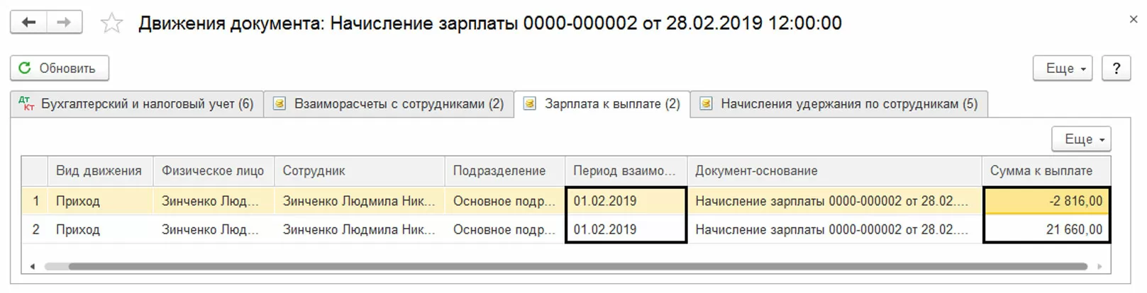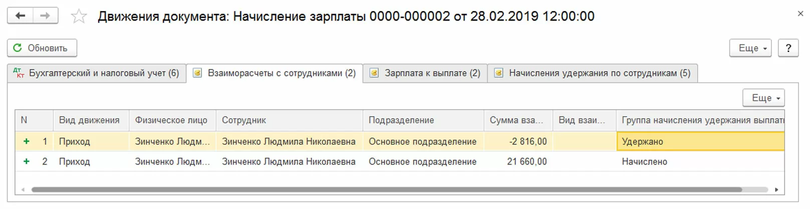 Перейдем к закладке регистра расчета «Зарплата к выплате». За февраль по сотруднику документом «Начисление зарплаты» в этом регистре сделано две записи – строка «Приход на сумму начисленной зарплаты» и сумма НДФЛ со знаком минус.