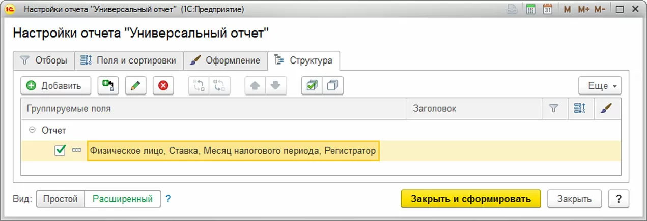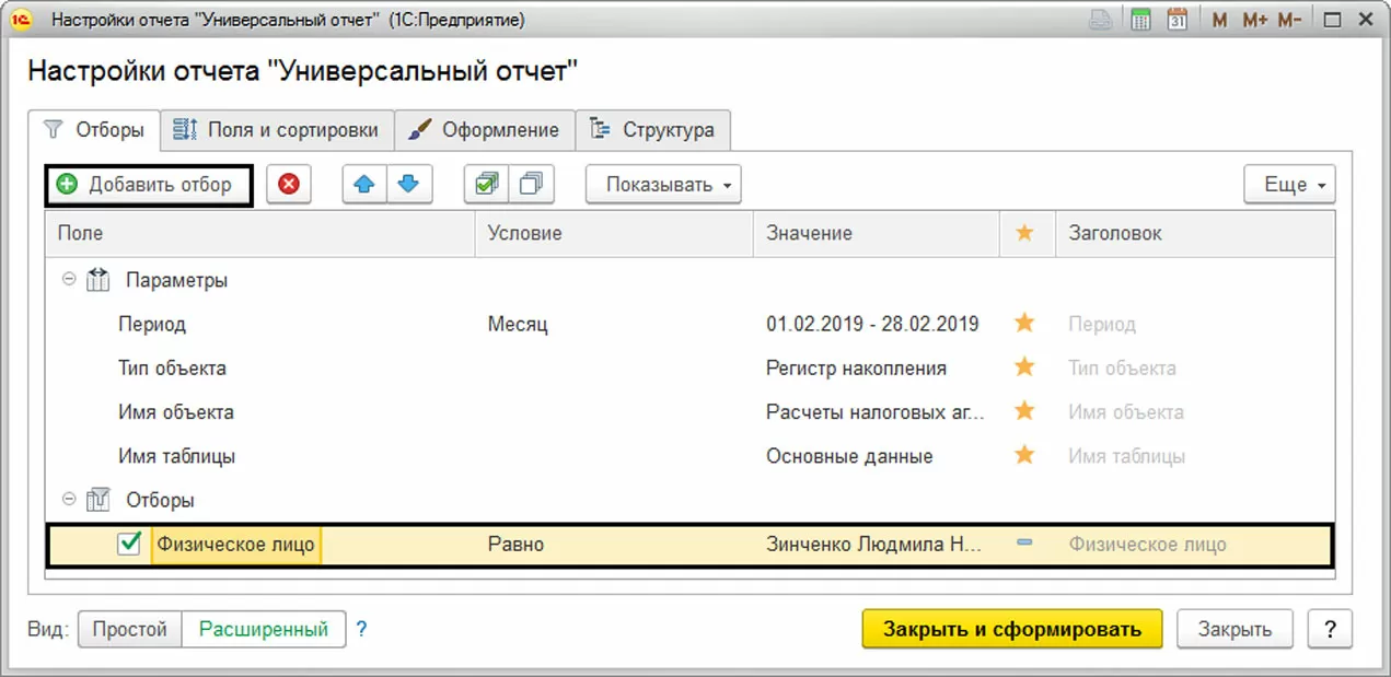Например, на закладке «Отбор» мы можем установить отбор по любому доступному элементу, например «Физическое лицо» - кнопка «Добавить отбор».