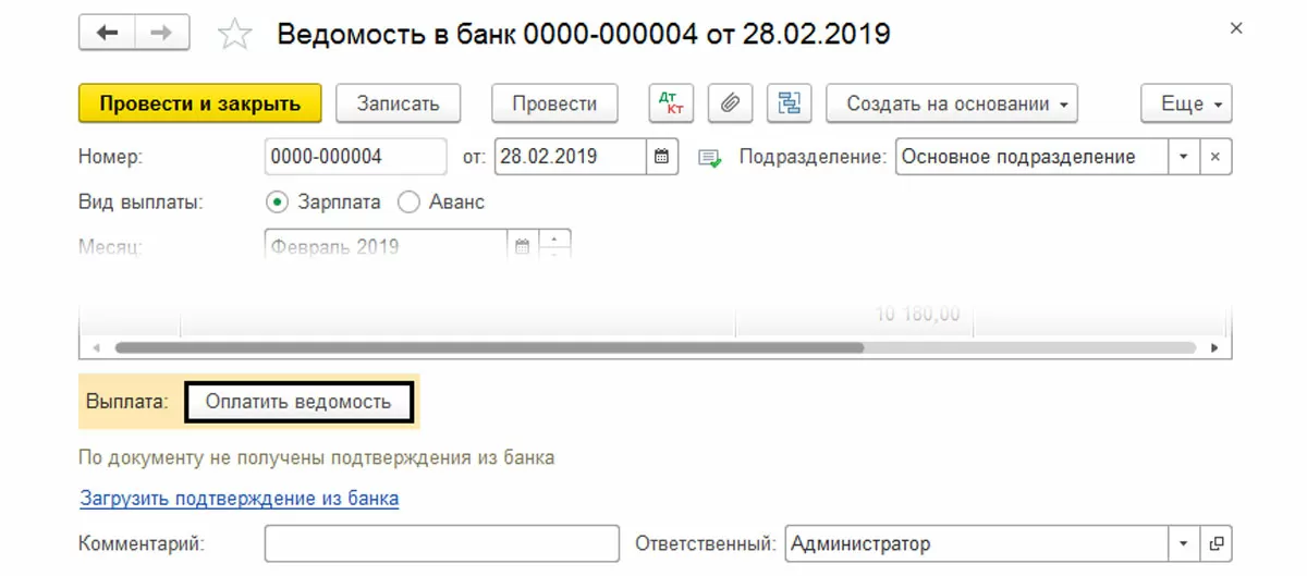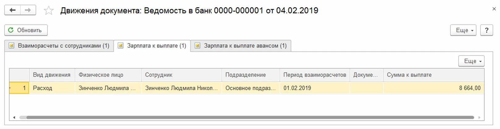 Сформируем документ «Ведомость в банк» и выплатим сотруднику аванс. После проведения документа в регистре «Зарплата к выплате» фиксируется запись – строка «Расход» на сумму выплаченного аванса. Т.е. сумма долга перед работником уменьшается.
