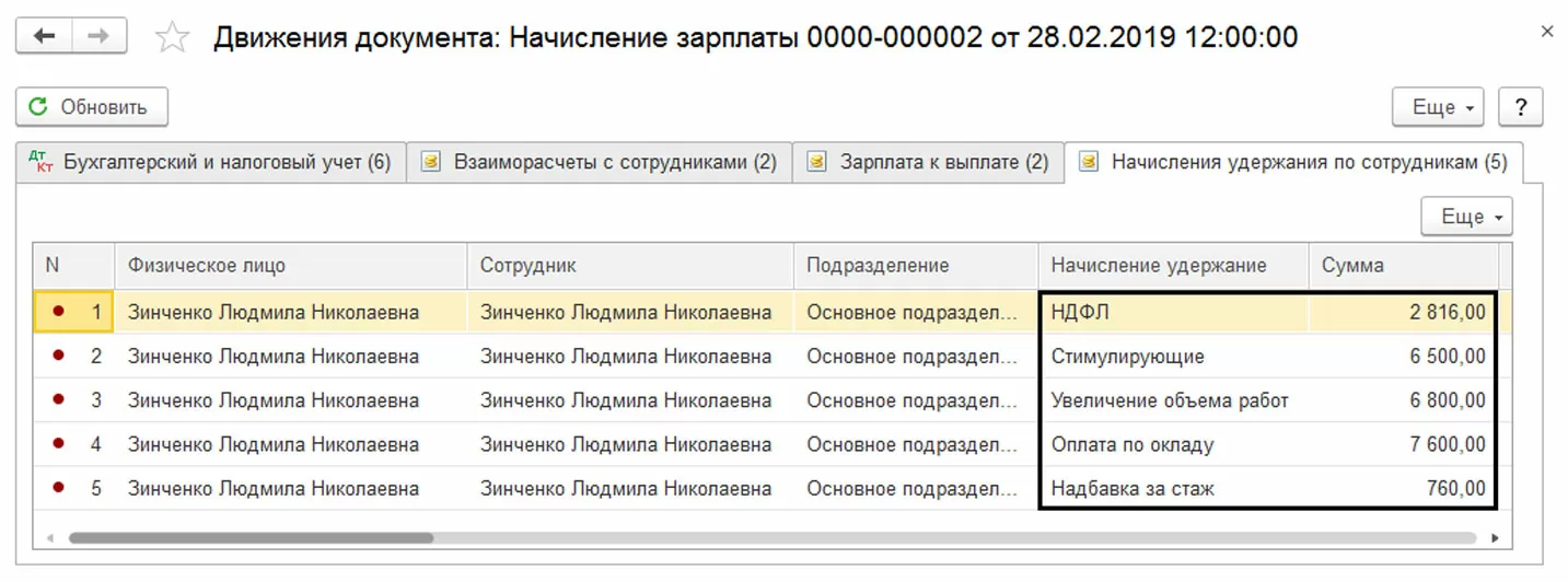В регистре «Начисления удержания по сотрудникам» в регистрах сделаны записи отдельно по каждому виду расчета.