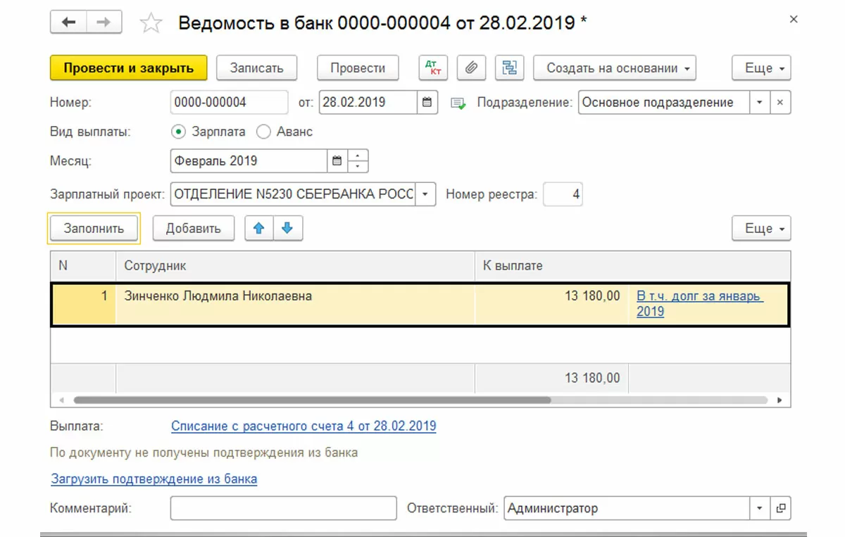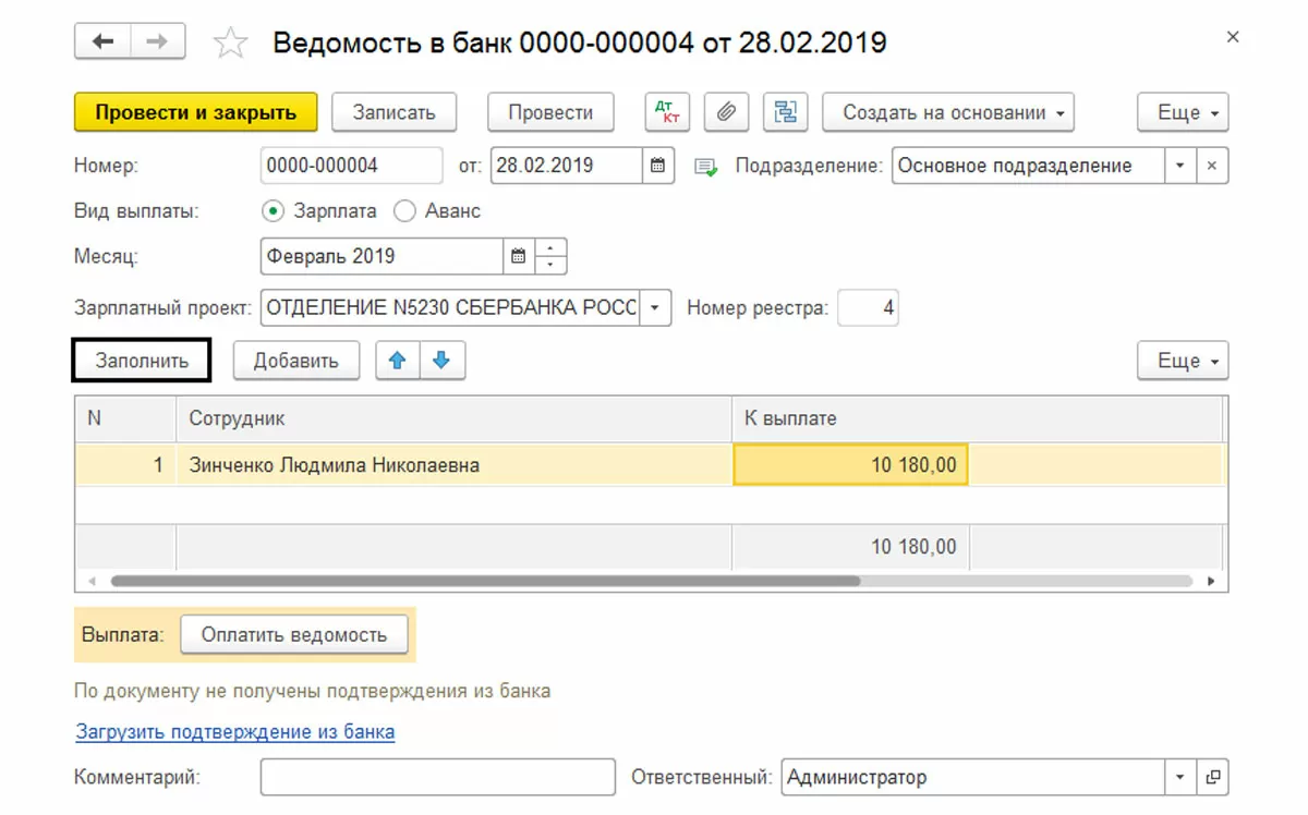 Рассчитаем окончательную выплату. Сформируем документ «Ведомость в банк», нажмем кнопку «Заполнить», и программа автоматически на основании данных регистров укажет сумму к выплате.