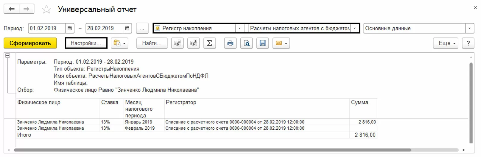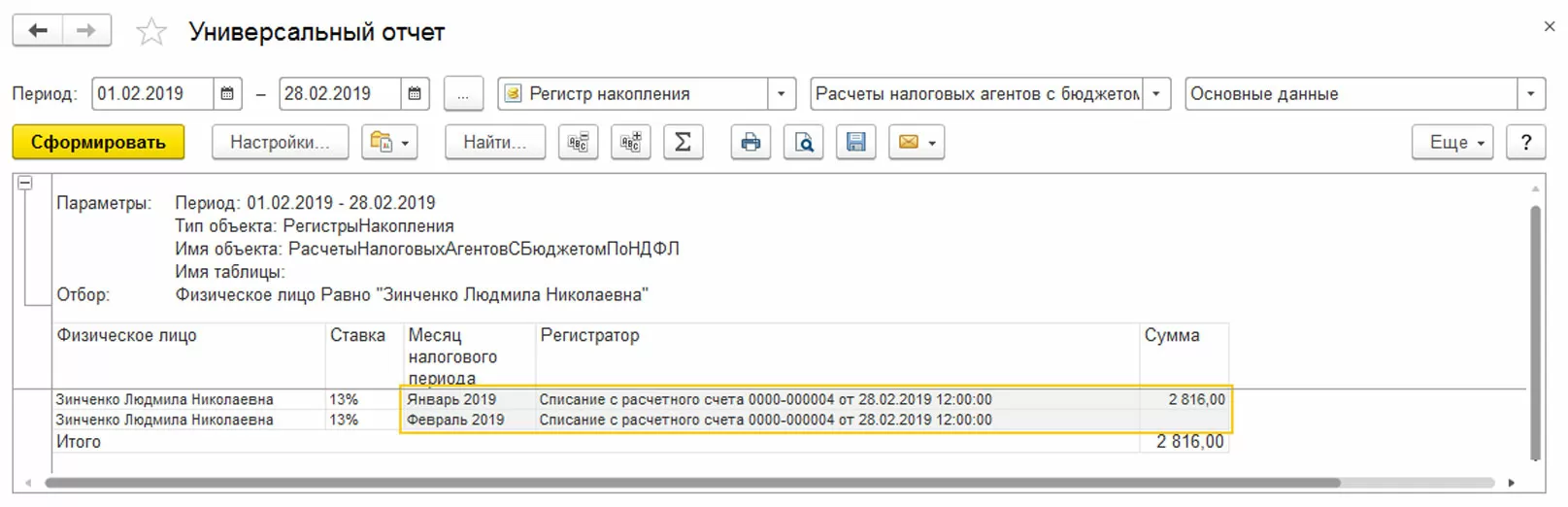 Сформировав отчет по регистру «Расчеты налоговых агентов с бюджетом по НДФЛ», мы видим, что документом «Списание с расчетного счета» в феврале производилась запись по перечисленном НДФЛ за январь, хотя данным документом производилась уплата НДФЛ за февраль. Поэтому надо проанализировать данные, выяснив, почему не отражен НДФЛ за январь.