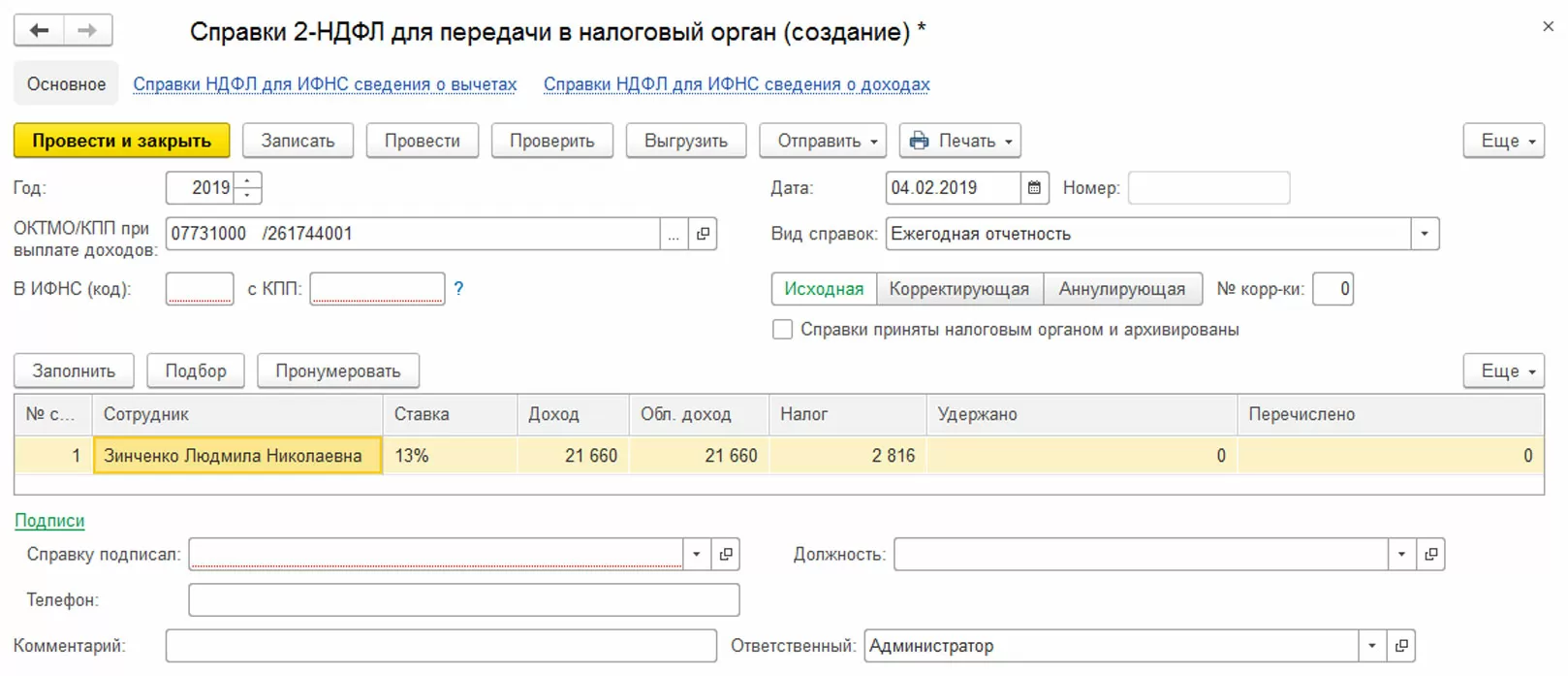 Сформируем справку «2-НДФЛ для передачи в налоговый орган» (в разделе меню «Отчеты» - «1С-Отчетность» - «Регламентированная отчетность» или раздел меню «Зарплата и кадры» - «НДФЛ»). Мы видим в отчете по сотруднику знакомые цифры – доход начислен в сумме 21660 руб. и НДФЛ – 2816 руб. Но мы видим, что НДФЛ удержано и перечислено, но у нас не зафиксировано.