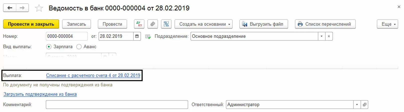 Оплата ведомости в программе «1С:Бухгалтерия 3.0» формируется документом «Списание с расчетного счета».