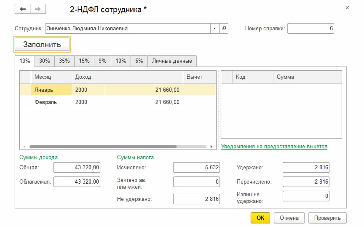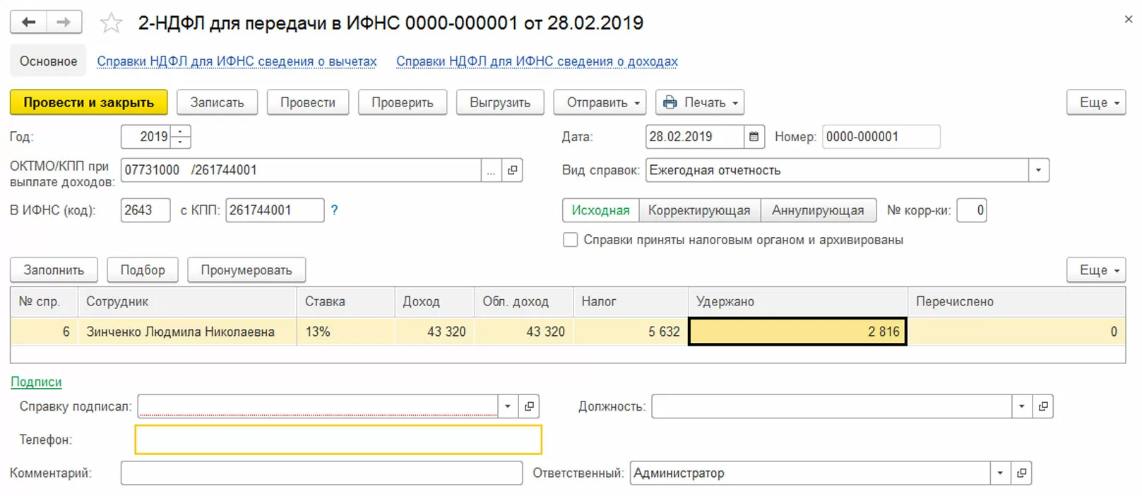 Сформируем повторно «Справку 2-НДФЛ для передачи в ИФНС». Мы видим, что сумма «НДФЛ удержанный» появилась в строке сотрудника.