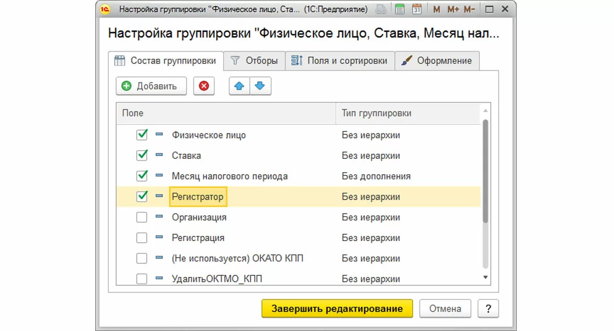 Раскрыв детализацию можно добавить или удалить поля, снимая и устанавливая галочки. Если нужного поля нет в предложенном списке, его можно добавить с помощью кнопки «Добавить». Чтобы узнать, каким документом сформирована запись регистра, необходимо отметить поле «Регистратор».