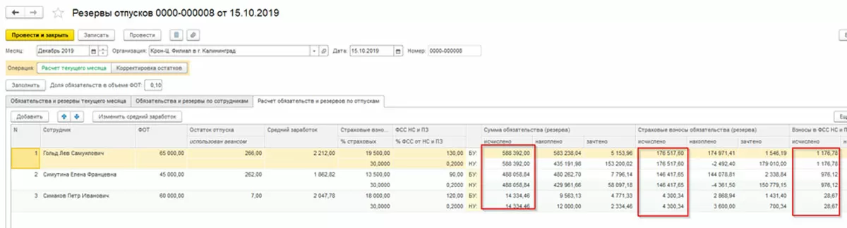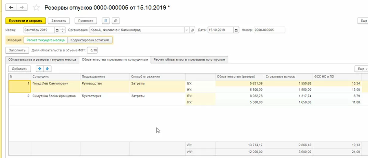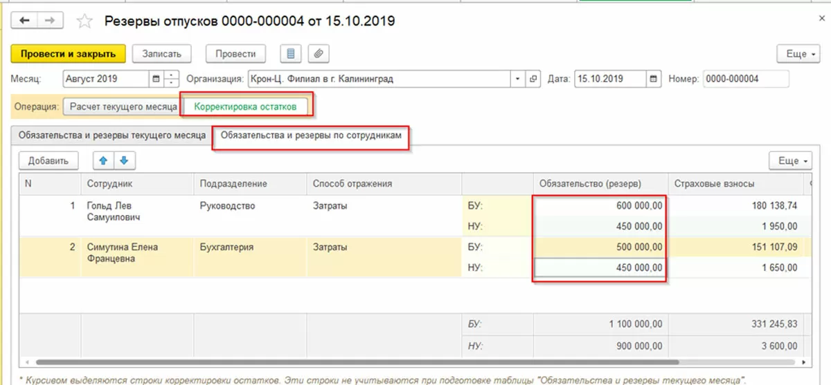 В декабре подводится итог по начислению ОО. Для этого используется тот же документ «Резервы отпусков» за декабрь месяц. Он рассчитывает оценочные обязательства по каждому сотруднику, причем и по БУ и по НУ используется метод МСФО, как более точный. Далее зачитываются данные, которые получаются при сравнении начисленных оценочных обязательств с окончательным расчетом за год.