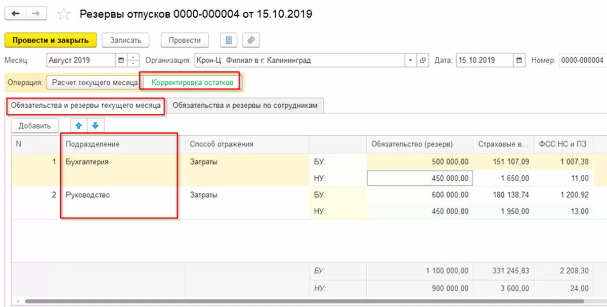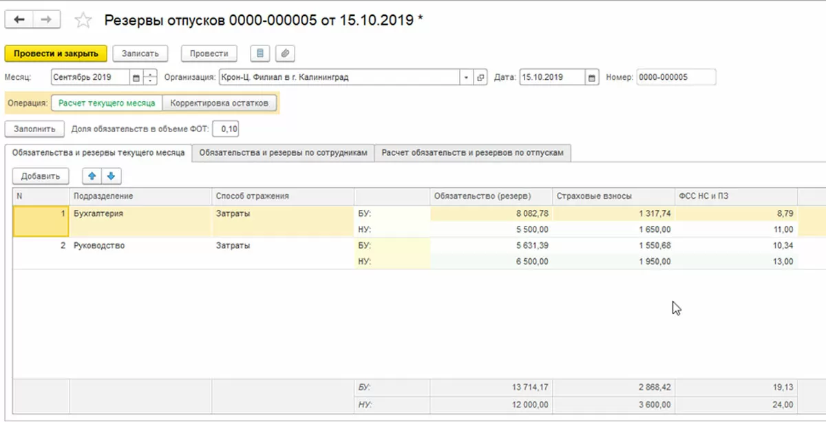 После этого работа с резервами отпусков при закрытии месяца может вестись аналогично 1С:ЗУП, с отражением начисленных резервов отпусков в соответствующем документе. Проводки будут отражаться по счету 96 «Оценочные обязательства».