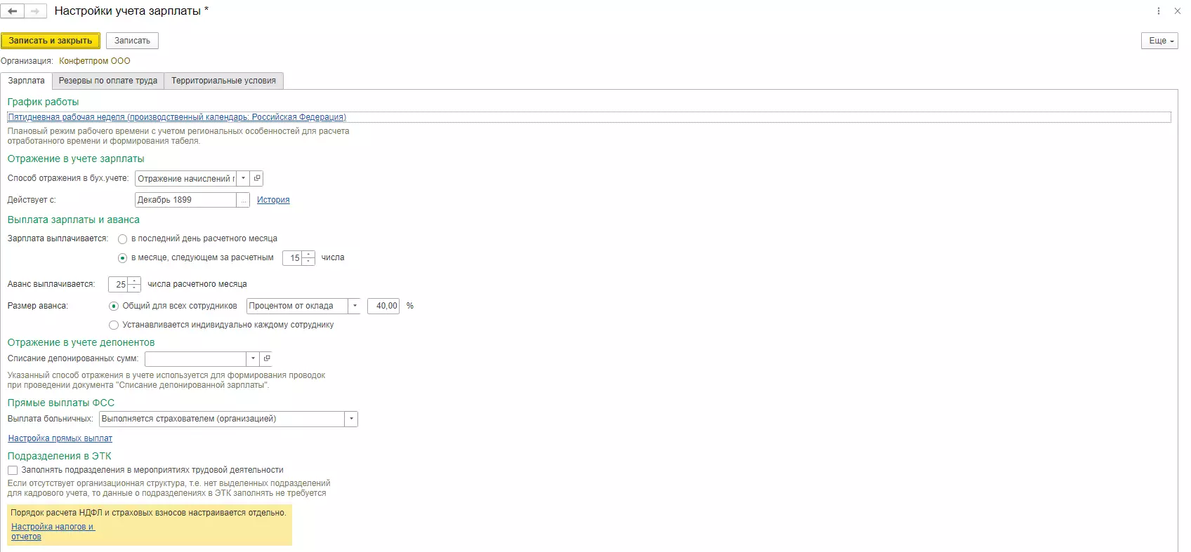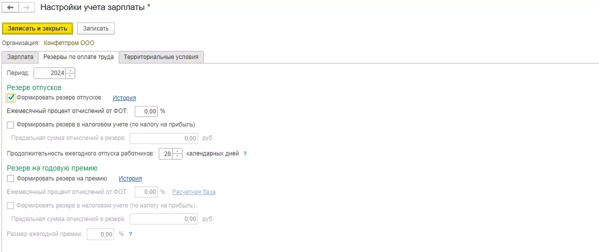 - Размер отчисления в процентах от ФОТ: проставляется вручную. Наиболее распространенное значение рассчитывается как 100% поделенное на 12 месяцев, что составляет около 8 процентов;