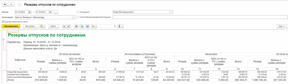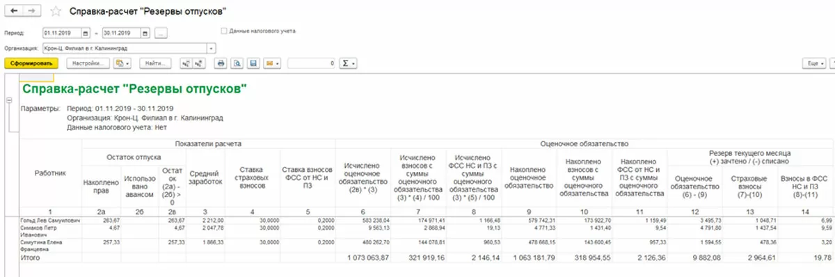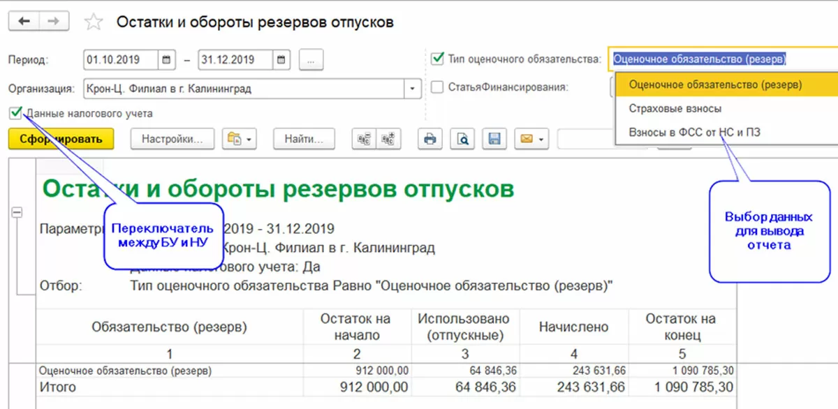 Отчет выводит те же данные, которые рассчитываются в документе «Резервы отпусков» на закладке «Расчет обязательств и резервов по отпускам». Отличие состоит лишь в том, что в зависимости от настройки отчета мы видим данные либо БУ, либо НУ.