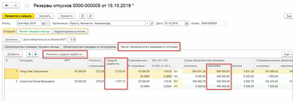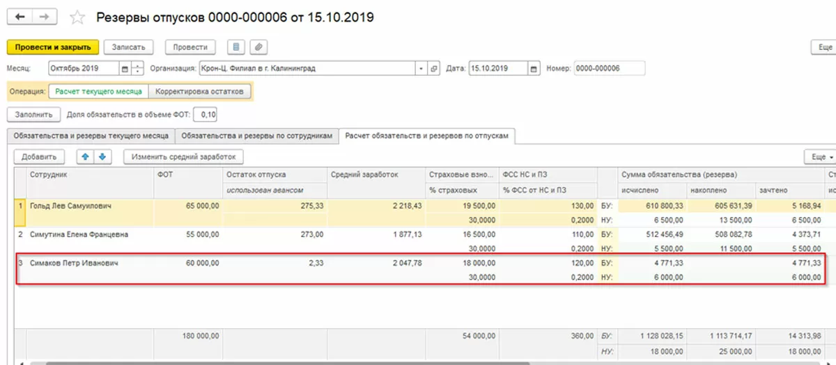 Предположим, в компании появляется новый сотрудник. В нашем примере его приняли 1 октября 2019 года. Проверим, как система отразит его появление. В документе «Резервы отпусков» он появится в расчете октября, при этом колонка «накоплено» у него пока что пустая.