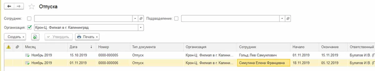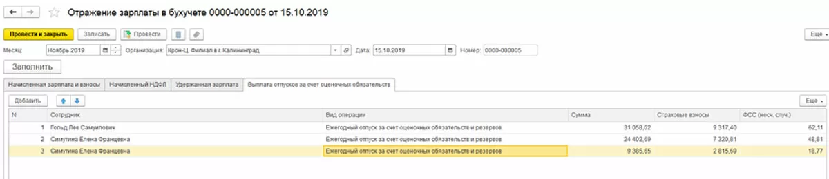Закрытие резерва отпусков происходит при начислении оплаты отпусков. Например, в ноябре 2019 года сотрудники Гольд и Симутина ушли в отпуск. У Симутиной – переходящий отпуск на декабрь месяц.