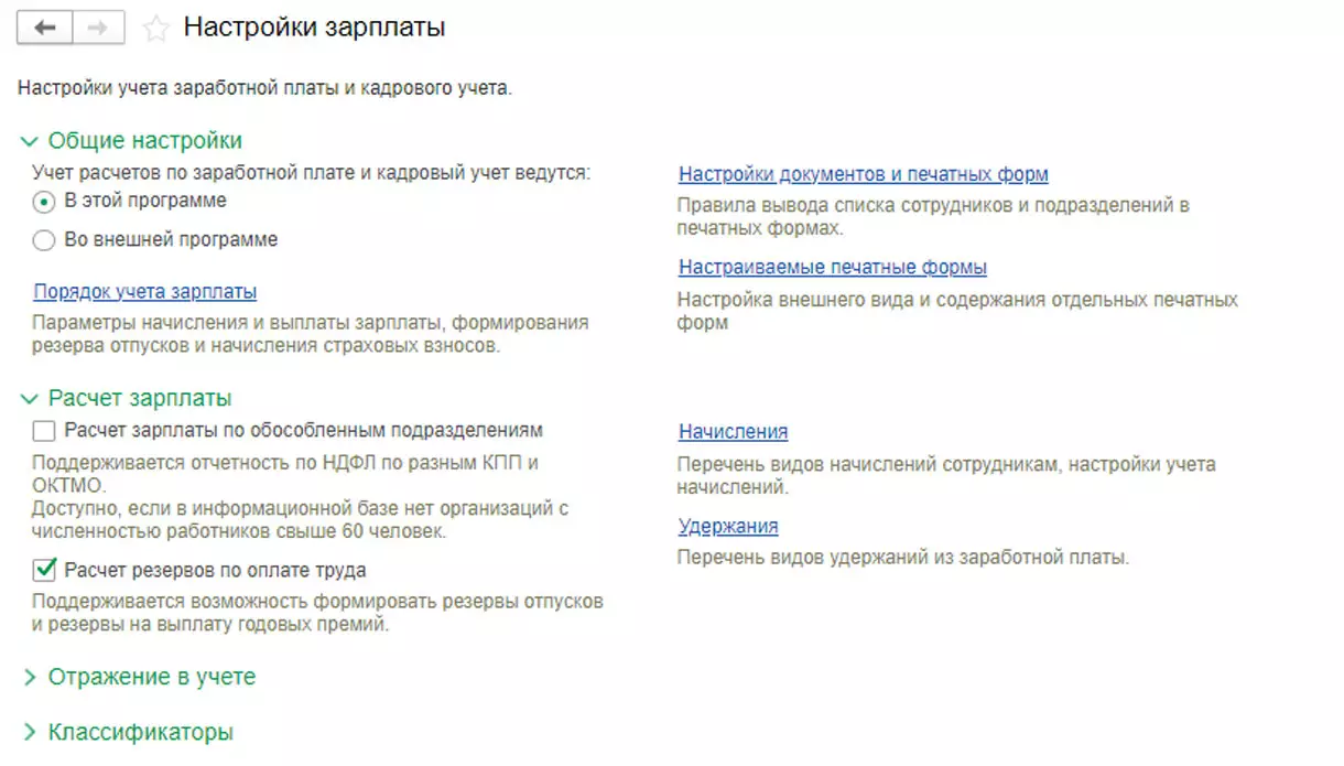 Для активации автоматического режима необходимо, во-первых, включить возможность автоматического формирования резервов отпусков, поставив флаг «Расчет резервов по оплате труда» в подразделе «Настройки зарплаты», находящихся в разделе «Зарплата и кадры». Это откроет возможность активировать формирование резервов отпусков для каждого из юридических лиц, хранящихся в системе.