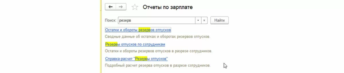 Отчеты по оценочным обязательствам легко найти в разделе «Зарплата», набрав в поисковой строке слово «Резерв».