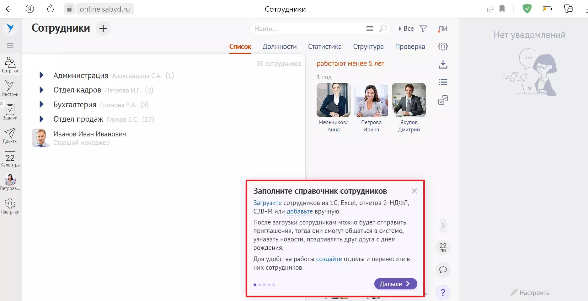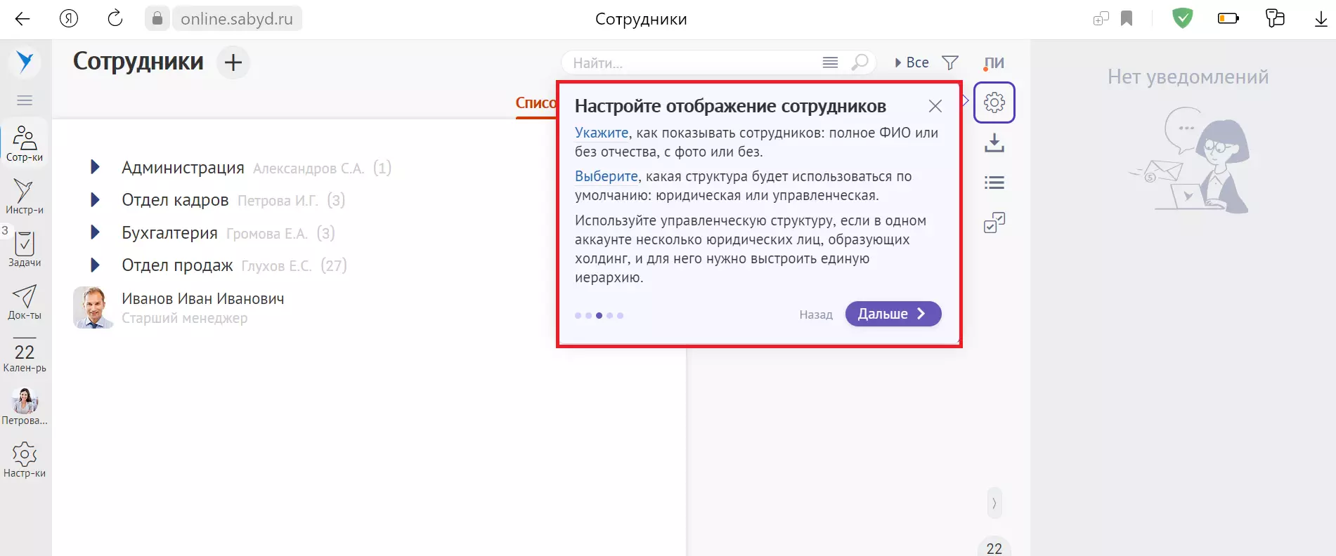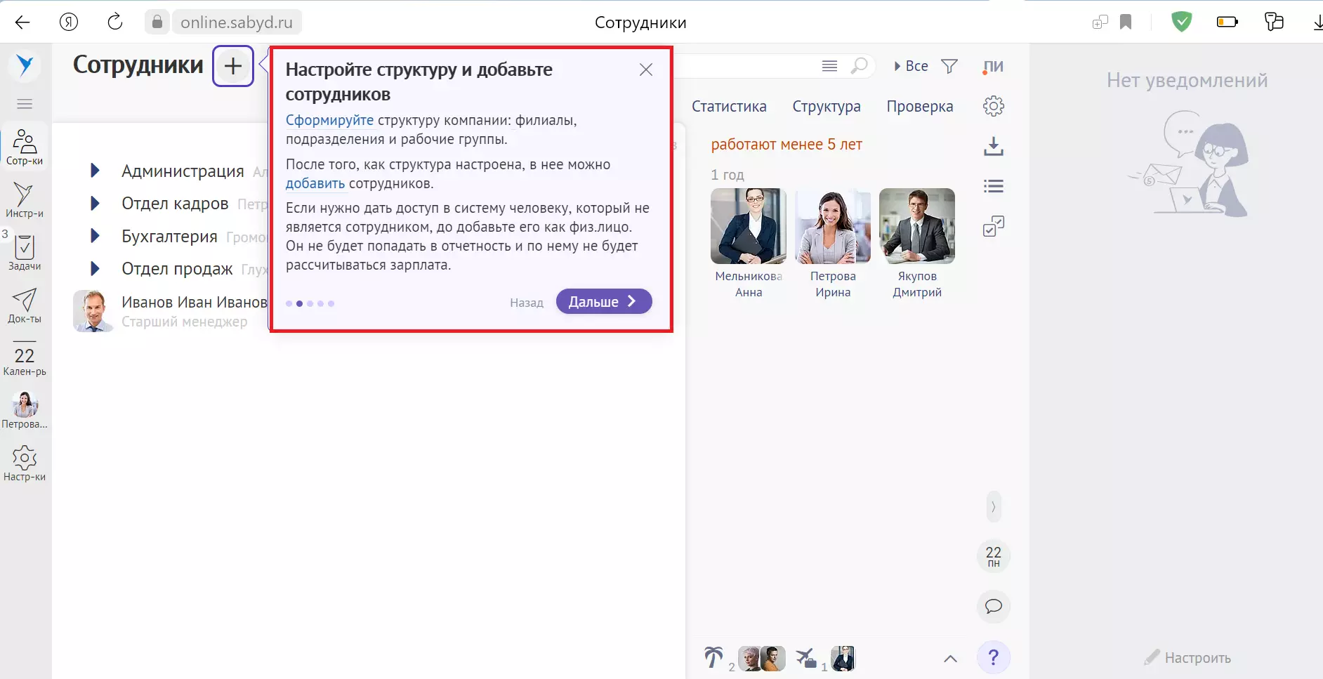 - Настройка структуры компании – помогает пользователю ввести данные о подразделениях, отделах и распределить по ним сотрудников.
